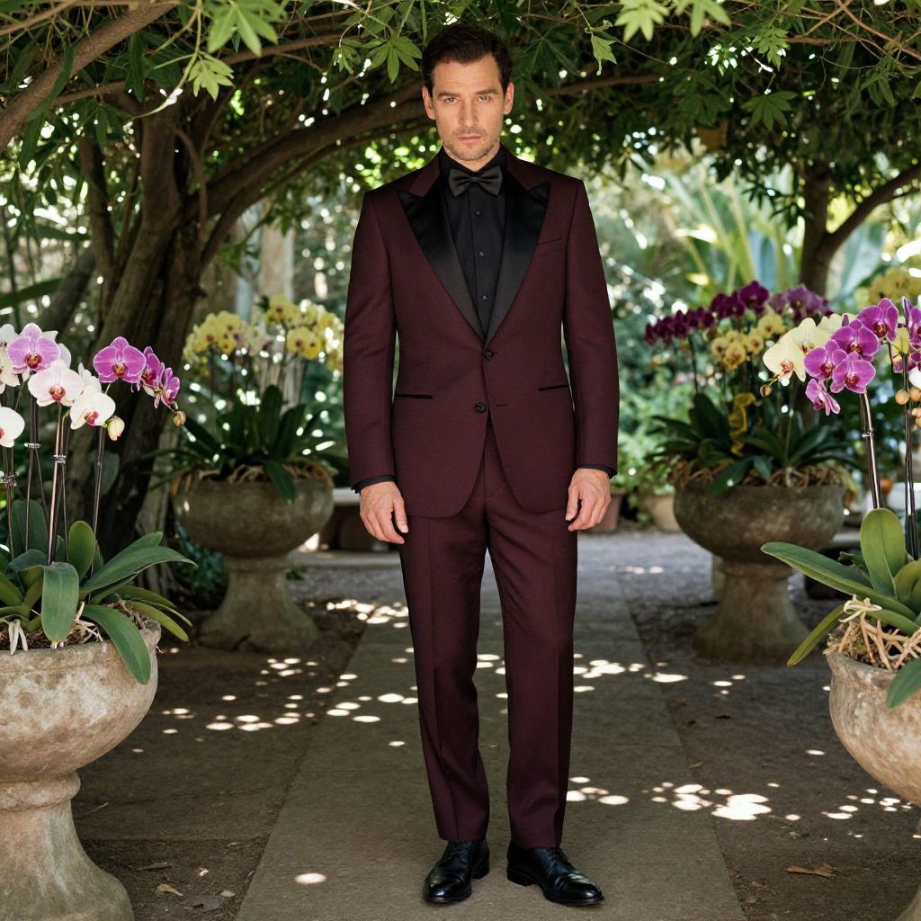 A man, burgundy single-button tuxedo, satin shawl collar, black dress shirt, black silk bow tie, black leather derby shoes, lush green canopy, vibrant orchids, dappled sunlight filtering through, vintage photo style, confident expression Man has masculine face and piercing eyes