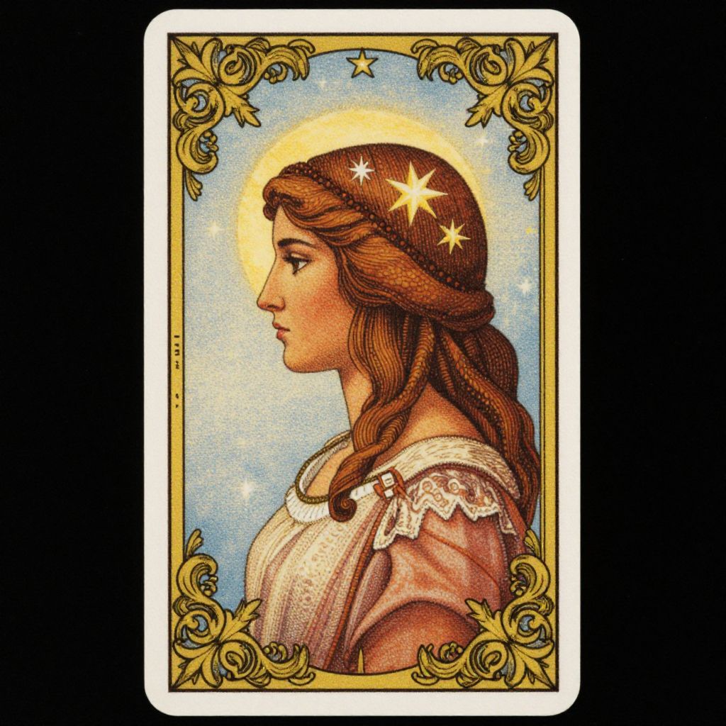 A neoclassical, celestial tarot card with a gold ornate border featuring a profile of a woman with stars in her hair.