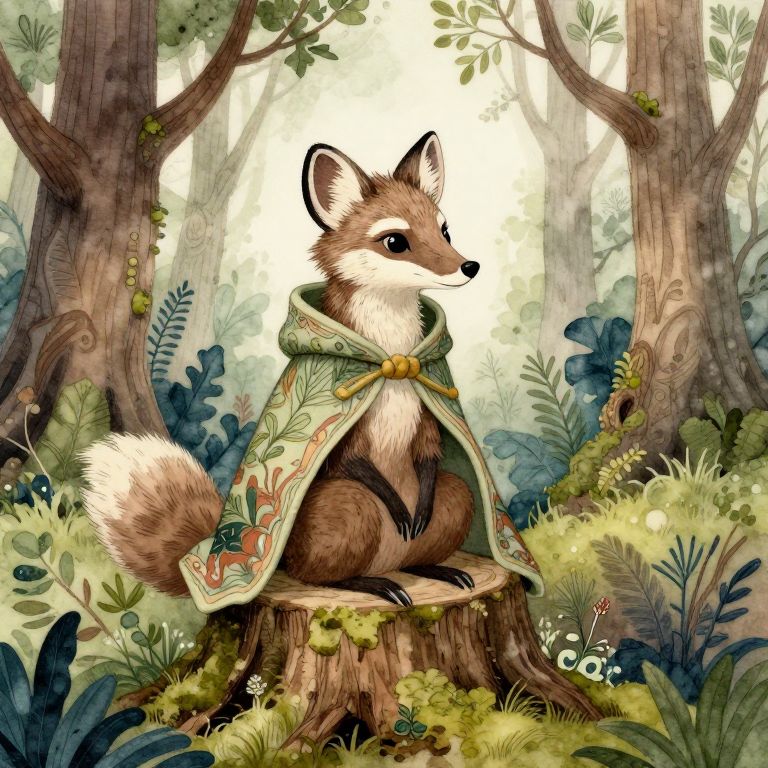 Digital fantasy artwork of an anthropomorphic fox in a beige fur-lined robe, standing by a forest stream, adorned with feathers and jewelry.