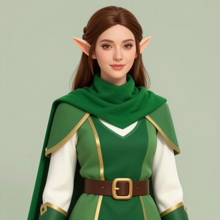 Female elf with brown hair, wearing a green and white outfit with a green scarf and a brown belt with a gold buckle.
