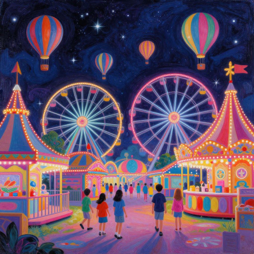 Illustrated vibrant comic-style image of a beach boardwalk carnival at night, featuring colorful carnival rides such as Ferris wheels and striped tents on both sides. The scene is set under a starry sky with a large moon, populated by diverse groups of people walking and enjoying the festivities. The artwork is inspired by the style of Jean-Michel Basquiat with bold lines and vivid colors.