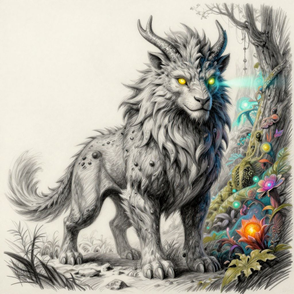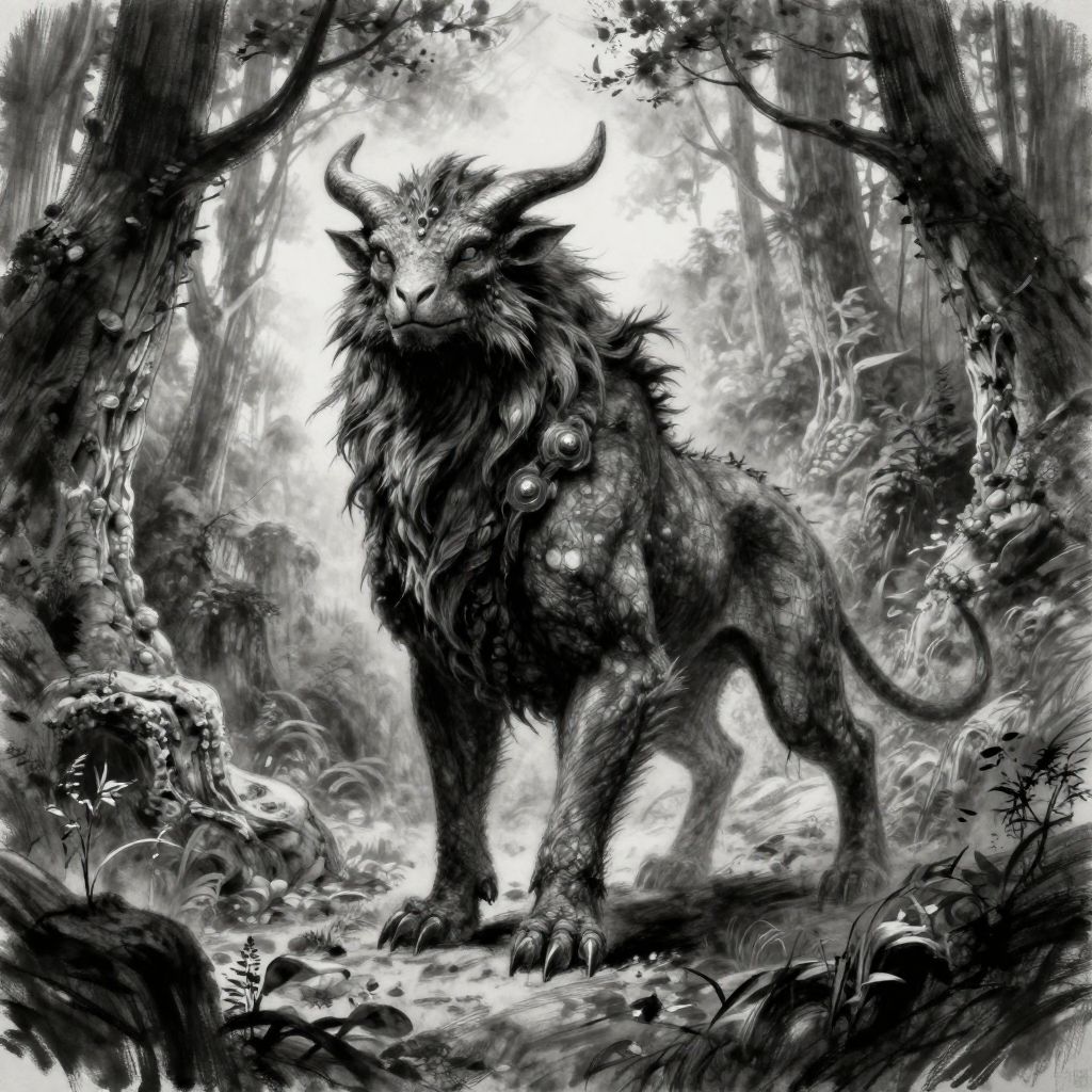 Drawings AI generating dynamic charcoal sketches of mythical creatures in enchanted forests, emphasizing texture and depth with dramatic lighting and rich shadows, capturing an ancient fantasy atmosphere in black and white tones.