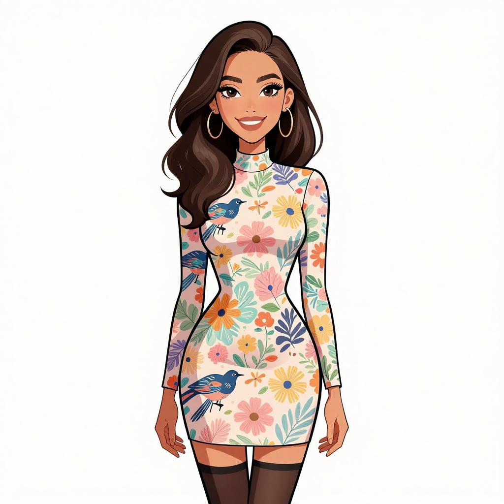 Digital illustration of a smiling woman with long, wavy black hair and light brown skin. She wears a sleeveless, high-neck, white lace dress adorned with colorful floral patterns in yellow, pink, green, and orange. The lace's delicate texture contrasts with the vibrant flowers. Her figure is slender with an hourglass shape. The background is plain white, emphasizing the subject. The art style is reminiscent of modern, vibrant comic book illustrations with bold colors and clean lines. The woman's confident pose and bright smile exude a cheerful and fashionable vibe.