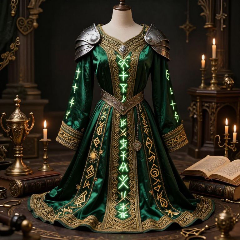 Fantasy outfit maker designing intricate medieval armor with glowing runes, delicate embroidered fabrics in rich tones of emerald and gold, surrounded by magical crafting tools and ancient spellbooks, ambient mystical workshop lighting