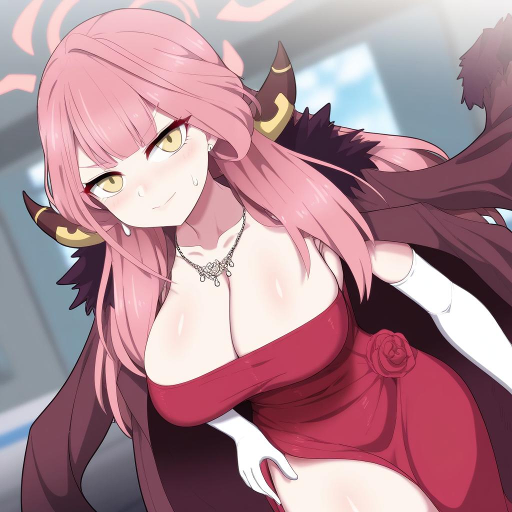 Aru (dress) (blue archive), blue archive, 1girl, demon horns, brown horns, yellow eyes, pink hair, long hair, red hair, large breasts, cleavage, collarbone, red dress, white gloves, coat on shoulders, strapless dress, elbow gloves, red coat, jacket on shoulders, halo, pink halo, earrings, necklace, side slit, by artist ganari ryuu, anime