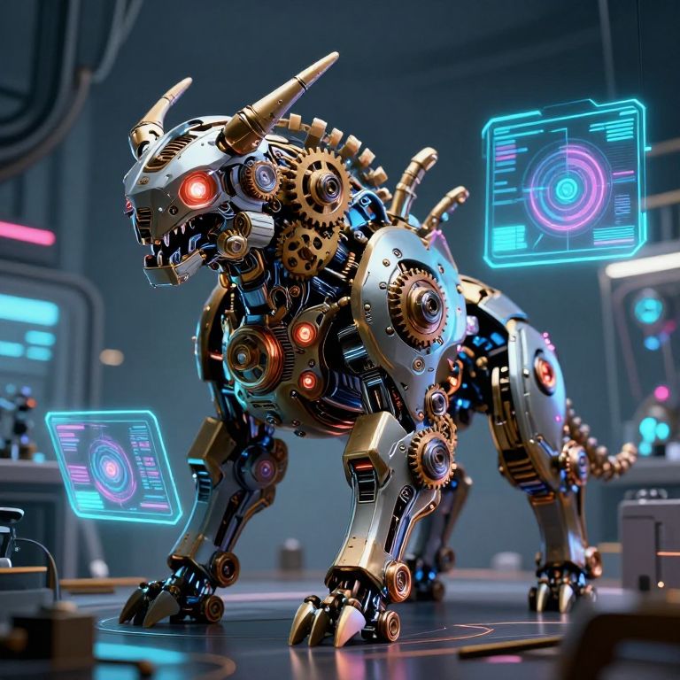 Ceating a futuristic mechanical beast, intricate gears and glowing lights, set in a high-tech laboratory with holographic interfaces, steampunk and cyberpunk fusion aesthetic, dynamic composition, neon highlights