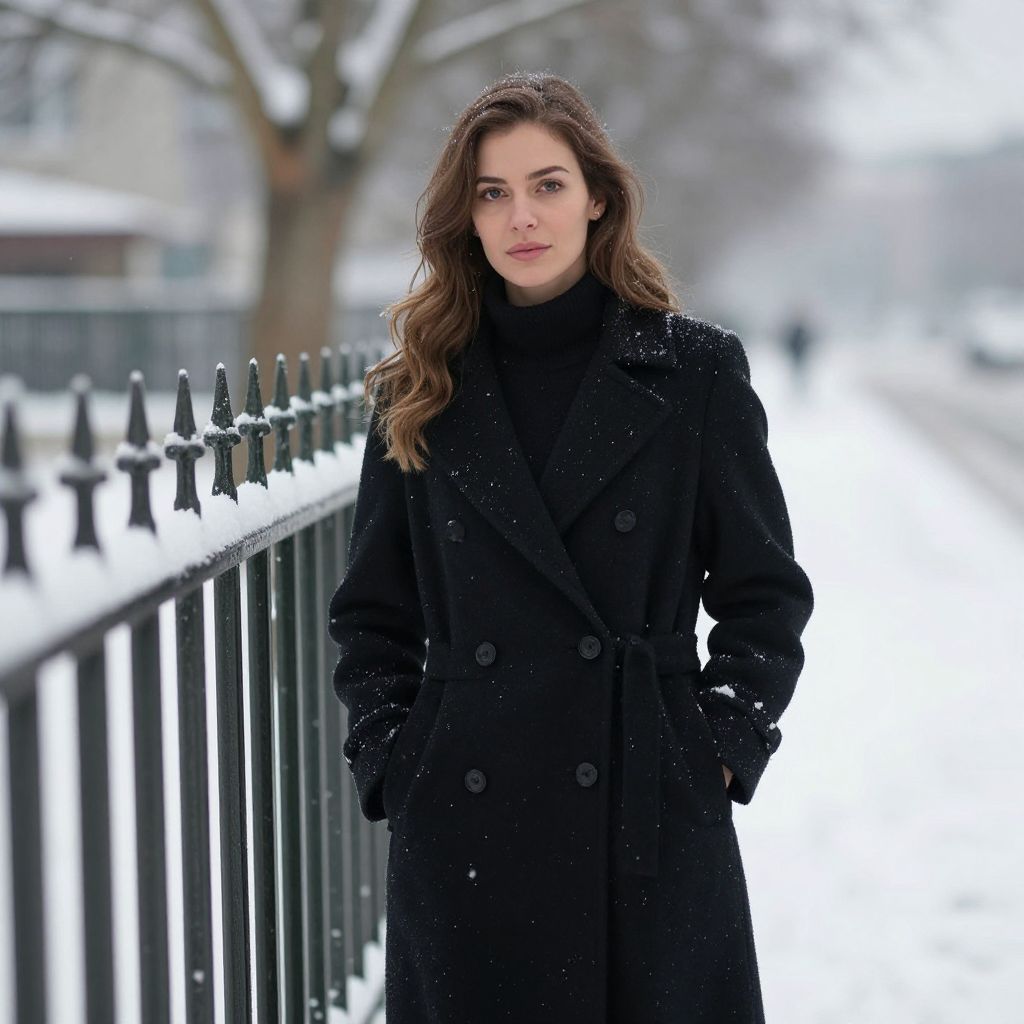 Photograph of a young woman with long, wavy brown hair and fair skin standing in a snowy urban park. She wears a black, double-breasted coat with hands in pockets, and black gloves. Her expression is serious, gazing directly at the camera. Snowflakes are visible on her coat and hair. The background features a black iron fence on the left, blurred trees, and a white, snow-covered pathway. The overall lighting is bright with a soft, overcast feel, enhancing the wintry atmosphere. The image has a sharp focus on the woman with a blurred background.