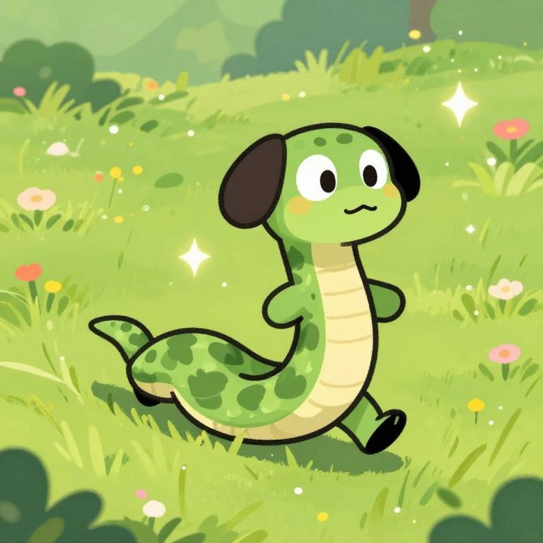 A cartoon-style snake dog hybrid running through an enchanted meadow, combining quick serpentine body with playful canine features, vivid color palette, whimsical and friendly expression, fantasy art with magical sparkles surrounding it