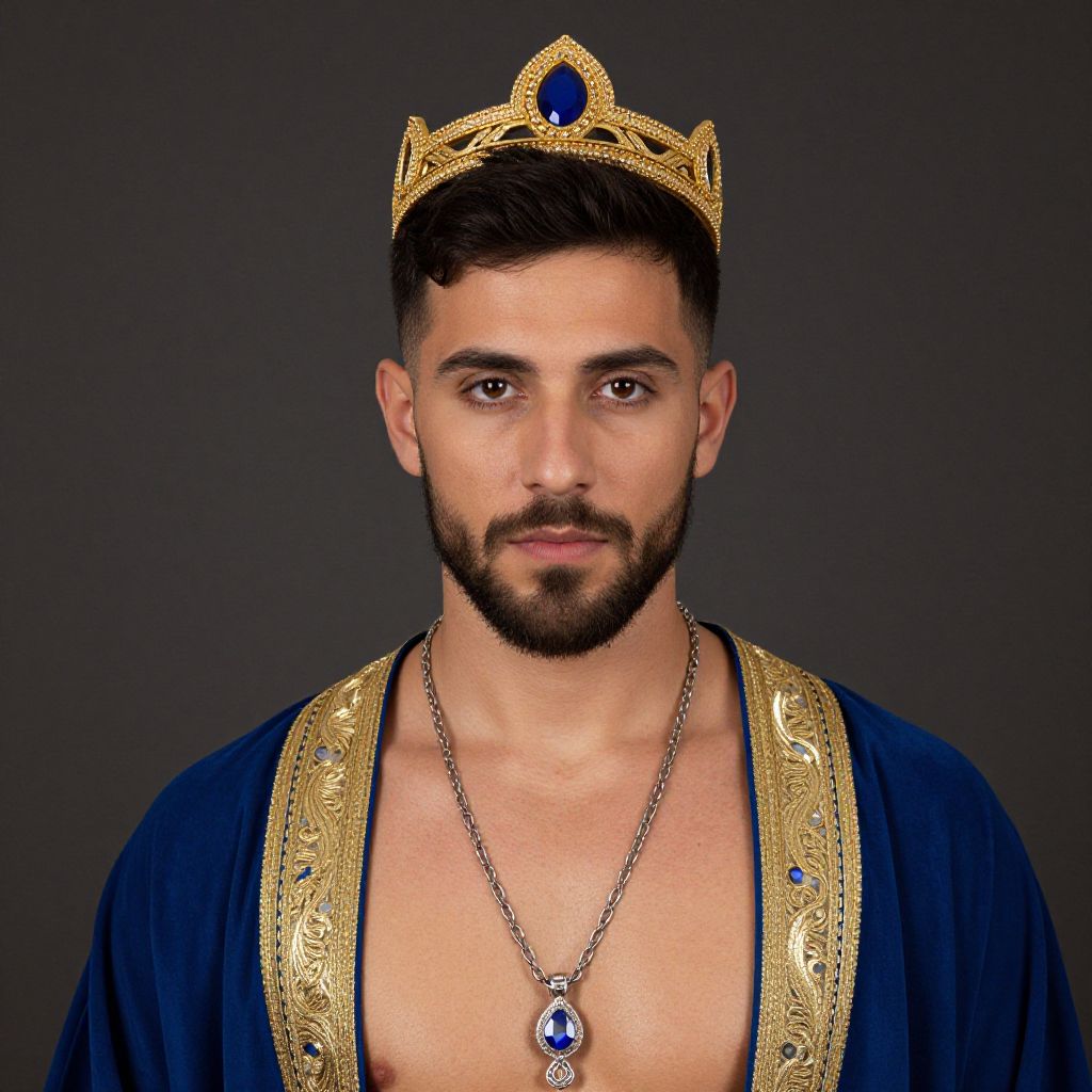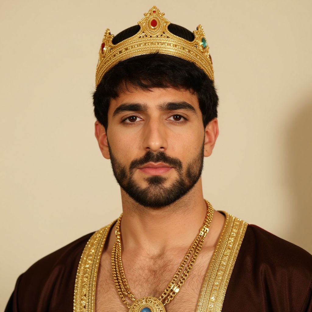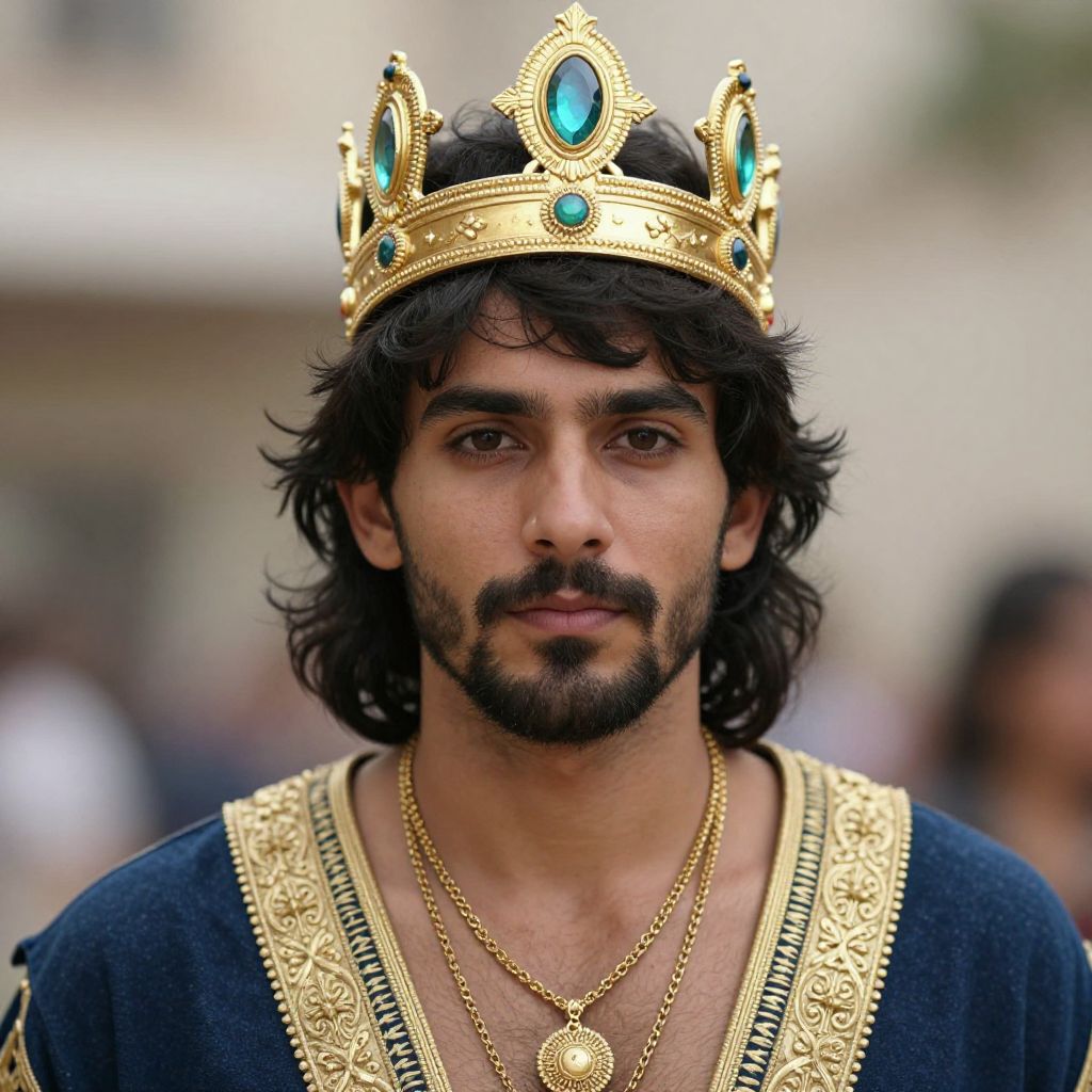Photograph of a young Middle Eastern man with a medium build and olive skin, wearing a black V-neck tunic and a gold crown with intricate designs. He has a short, dark beard and mustache, and wears a gold chain necklace with a small pendant. His expression is neutral, and he stands in a slightly blurred, outdoor setting with indistinct people in the background. The crown's bright gold contrasts with his dark clothing, drawing attention to his head. The overall composition focuses on his upper body, highlighting the regal accessory.