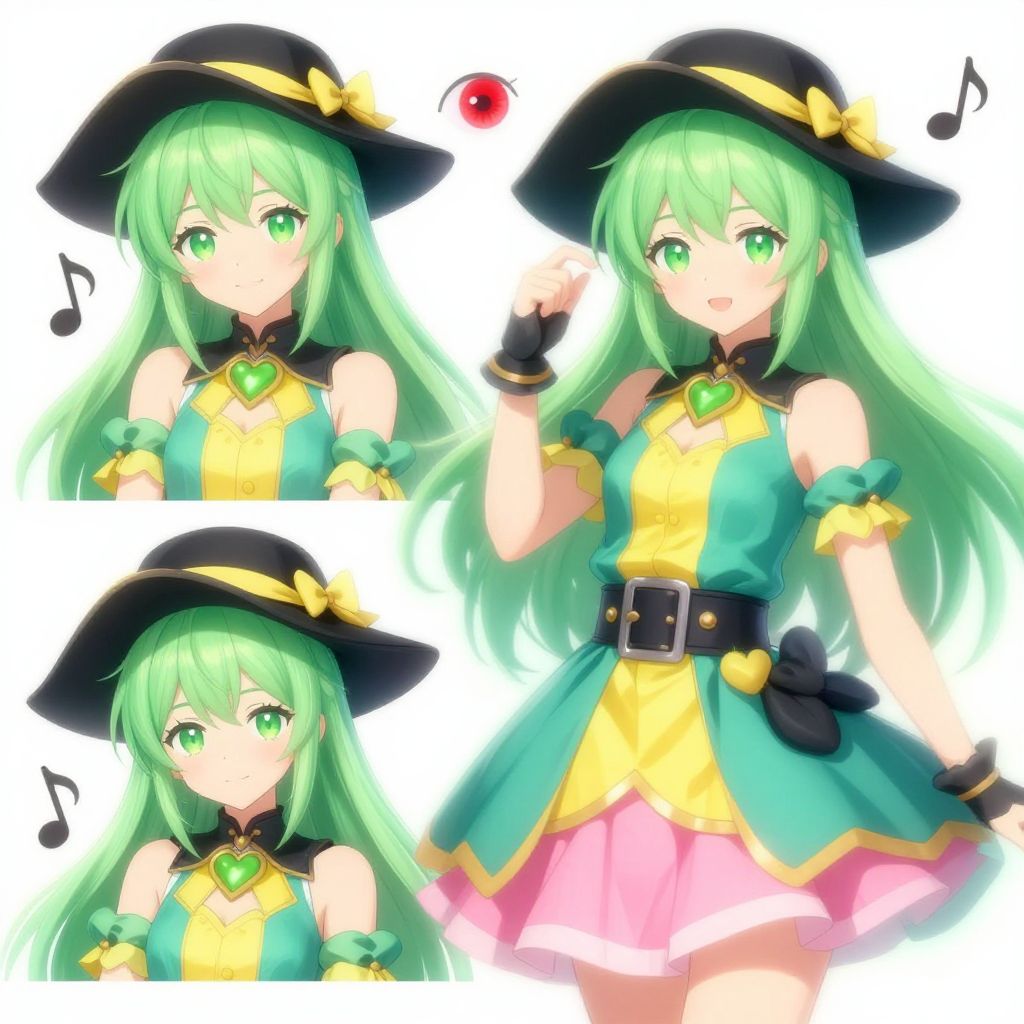 Digital illustration collage featuring a green-haired anime girl with green eyes, depicted in multiple poses. She is wearing a black hat with a yellow ribbon, a teal and yellow outfit with heart-shaped accessories, and a pink skirt in one pose. The image includes whimsical elements like a floating red eye and musical notes, emphasizing a fantasy or magical theme.