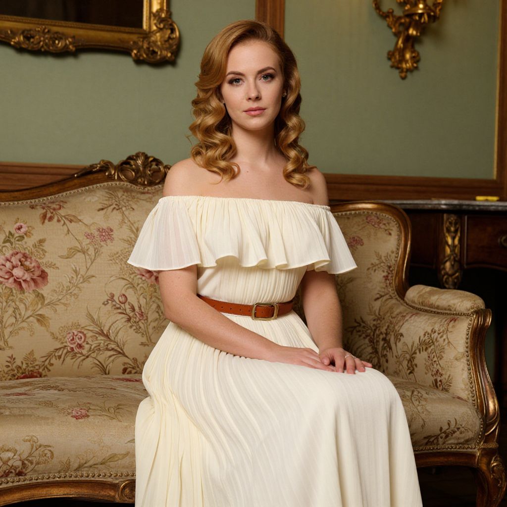 Elegantly seated in a vintage-style room, a woman dons a cream off-the-shoulder gown with ruffled sleeves and a brown belt, her golden curls cascading over her shoulders as she rests her hands gracefully on her lap, surrounded by floral-patterned upholstery and ornate decor.