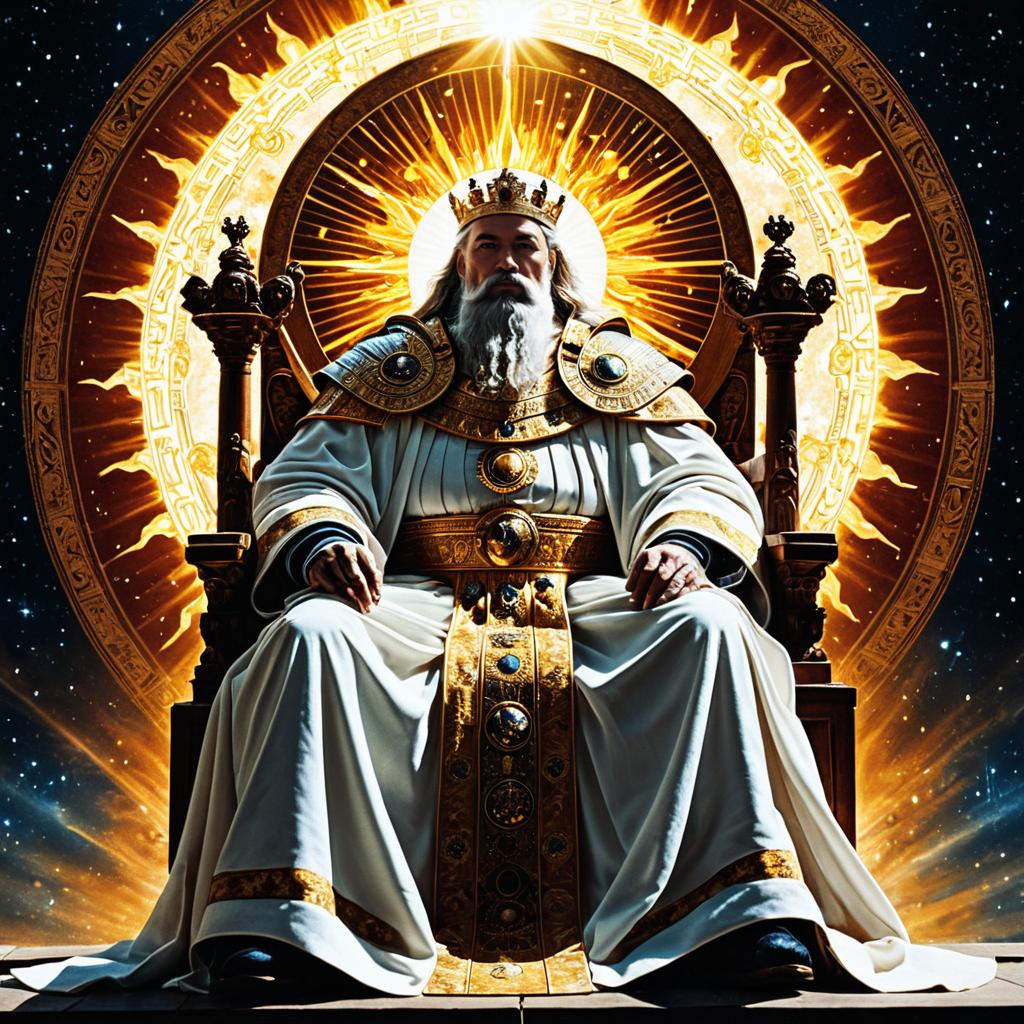Majestic illustration of a stern bearded man wearing ornate golden armor and a crown, seated on an intricately carved throne radiating with a golden celestial glow and surrounded by a starry sky. The throne and armor display detailed embellishments, emphasizing a divine and powerful presence.