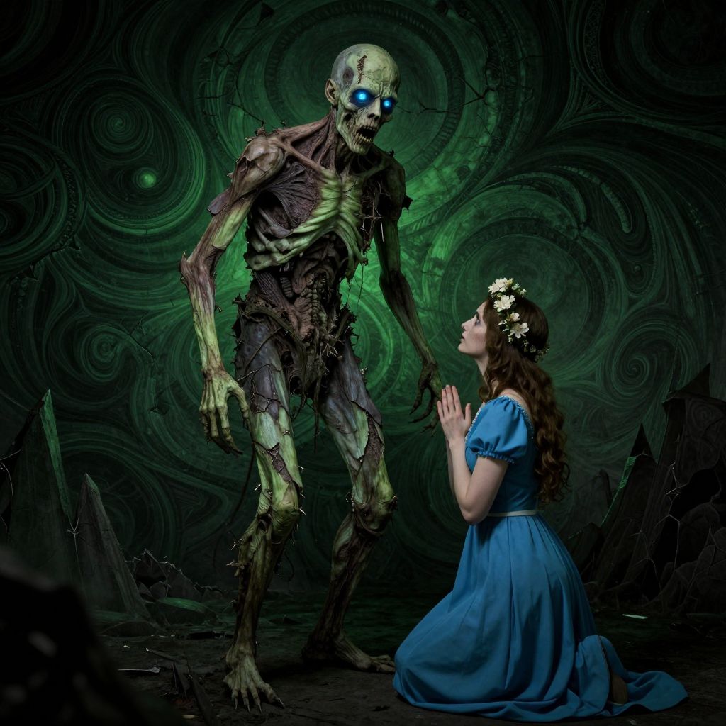 Photograph-style digital art depicting a dark, eerie scene. A skeletal, greenish humanoid monster with glowing blue eyes and torn flesh stands looming over a kneeling woman. She has long brown hair adorned with white flowers, wears a blue dress with puffed sleeves, and looks up at the creature with hands clasped in a prayer-like gesture. The background features swirling, dark, green patterns, adding a sense of mysticism and horror. The texture of the monster's skin is rough and decaying, contrasting with the smooth fabric of the woman's dress. The overall mood is ominous and supernatural.