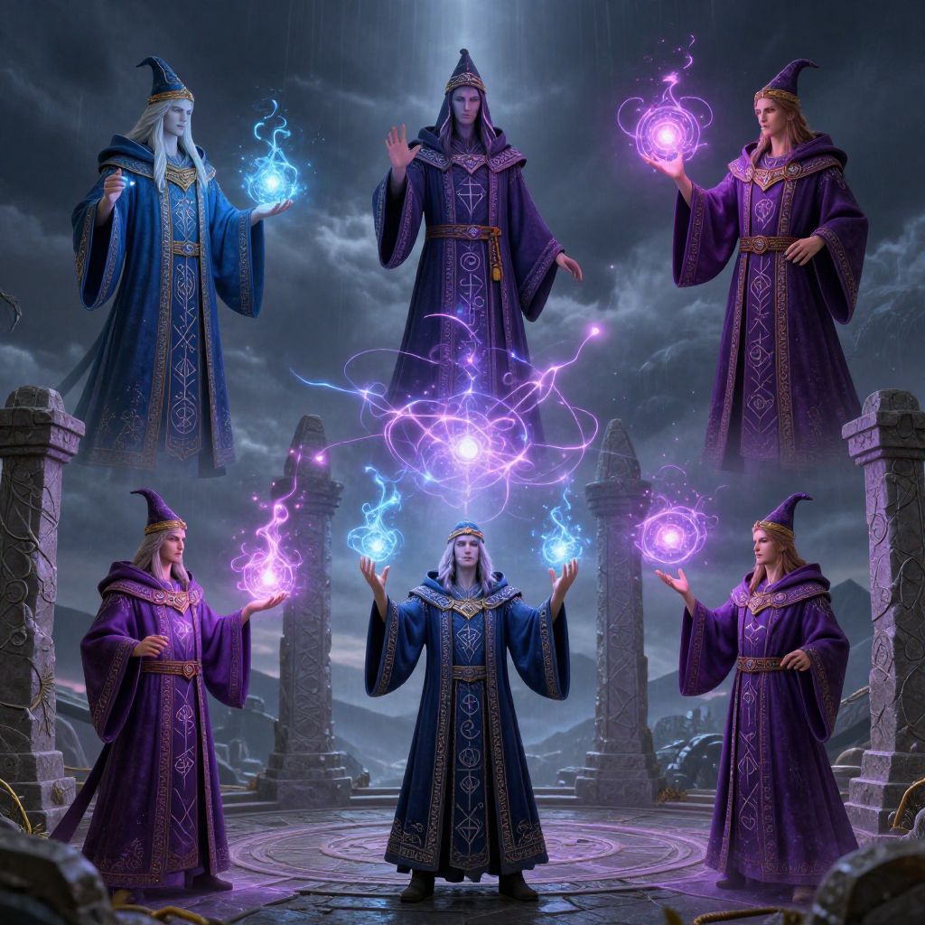 Digital art: Medieval-style scene with 12 statues holding blue flames in a circular mosaic, centered on a robed figure. Ornate columns frame the
