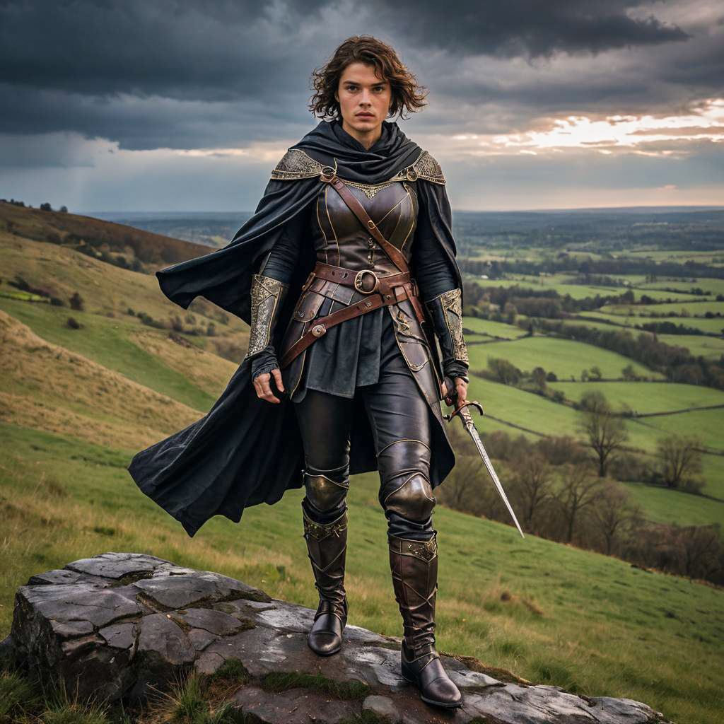 Portrait of an athletic woman with tangled short hair dressed in stitched leather armor, rugged trousers, metal-toed boots, and a velvet cloak. She stands on a rocky outcrop overlooking a green valley under a dark, stormy sky, embodying historical elegance from the Dark Age. The warrior holds a sword at her side, conveying strength and readiness against the dramatic landscape backdrop.