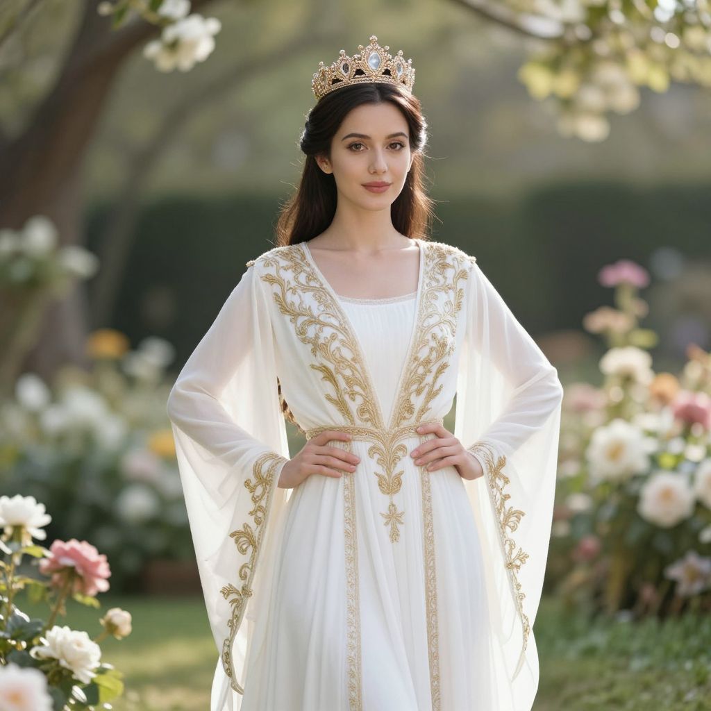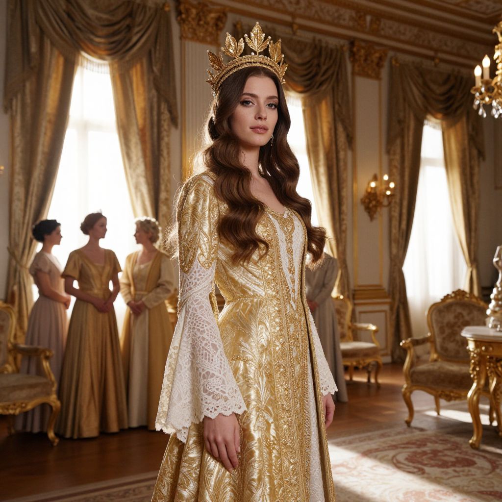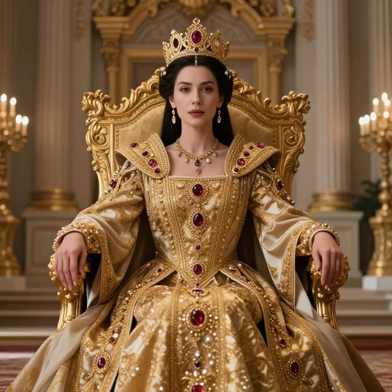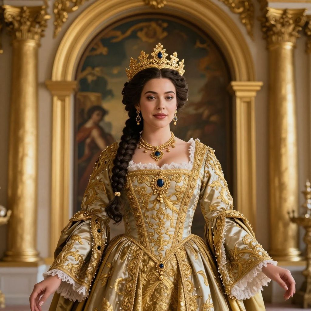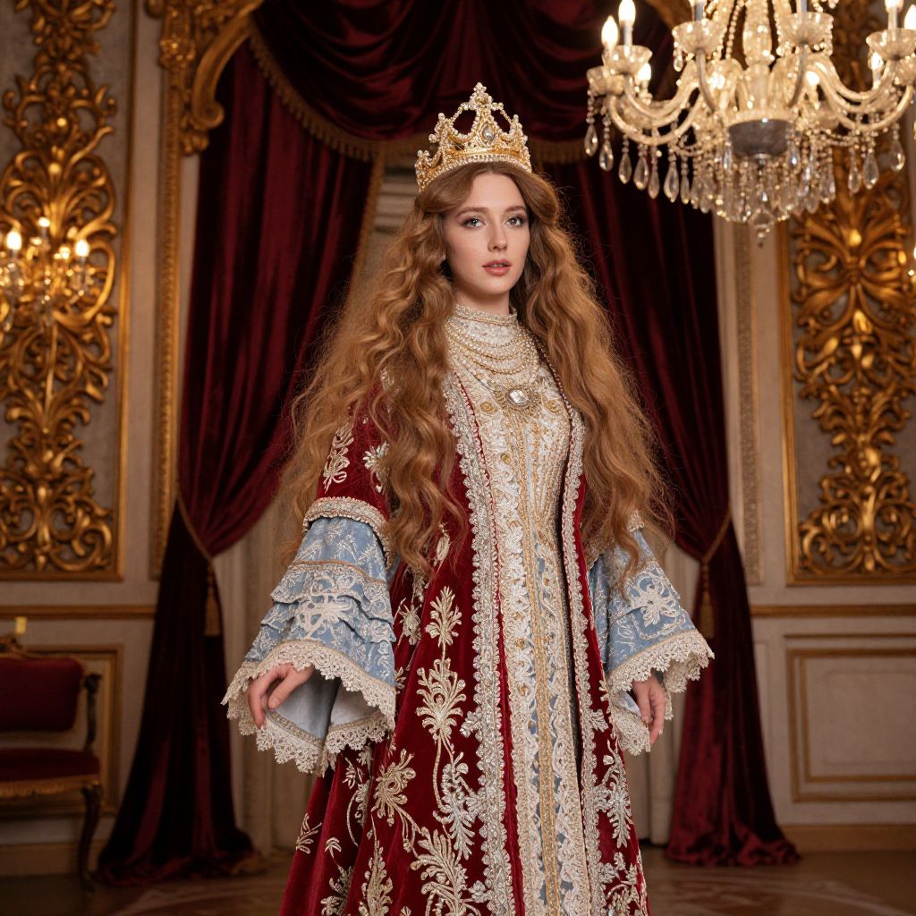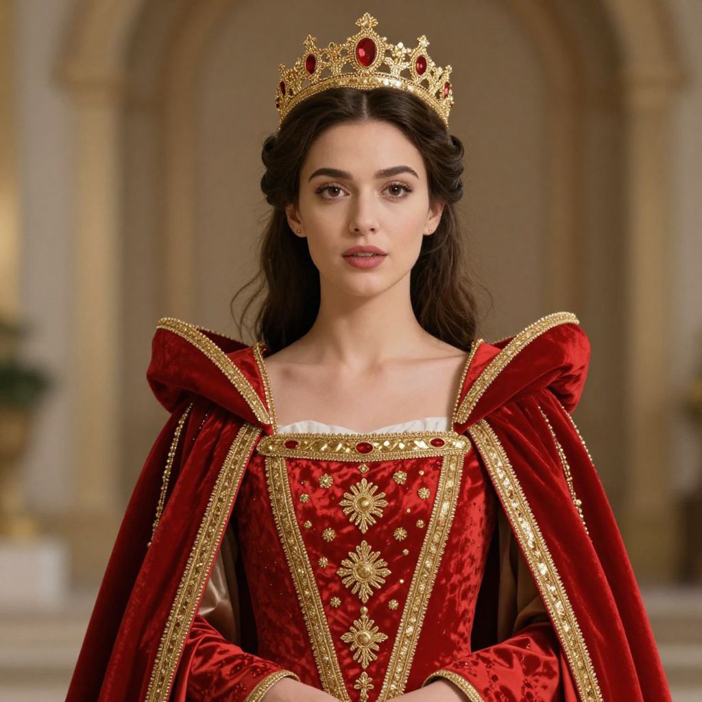 A person wearing a elaborate red and gold costume with intricate embroidery and flowing fabric, adorned with a majestic crown on their head, standing confidently in a grand, ornate hall filled with soft golden light, surrounded by ornate decor and glowing ambient details, evoking a sense of royal elegance and festive grandeur.