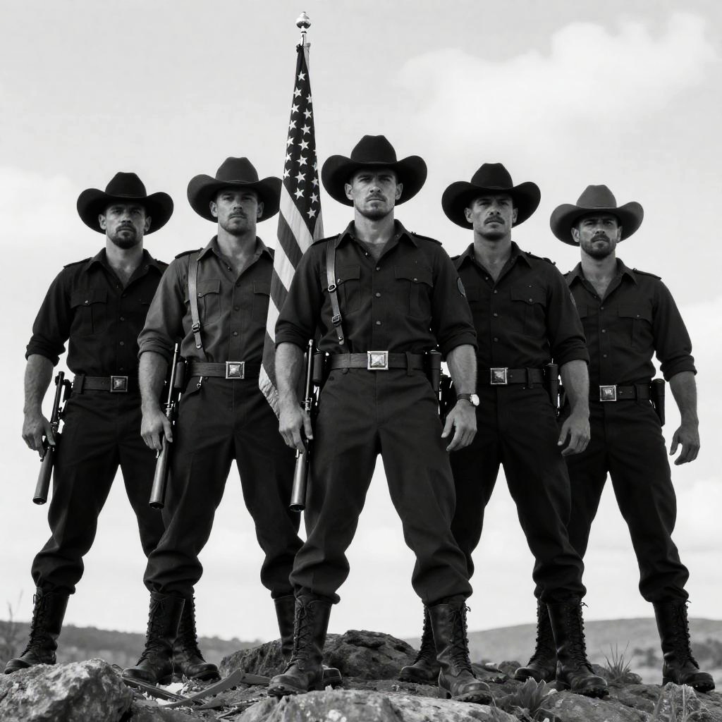 Black-and-white photo featuring six men dressed in classic cowboy attire, including hats and plaid shirts. The central figure, wearing a cowboy hat and plaid shirt, poses with his hand on his chin looking thoughtfully to the side. Two men in the foreground have serious expressions, one holding a pair of handcuffs. Three men in the background also wear cowboy hats and display intense, focused looks, creating a dramatic Western movie vibe. Text 'Steele for Demon Trouble' is displayed at the bottom.