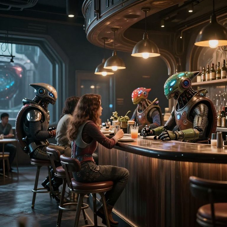 Neo scene in a cafe at the edge of the galaxy, with futuristic creatures sitting at the bar, realistic detailed, cinematic lighting,