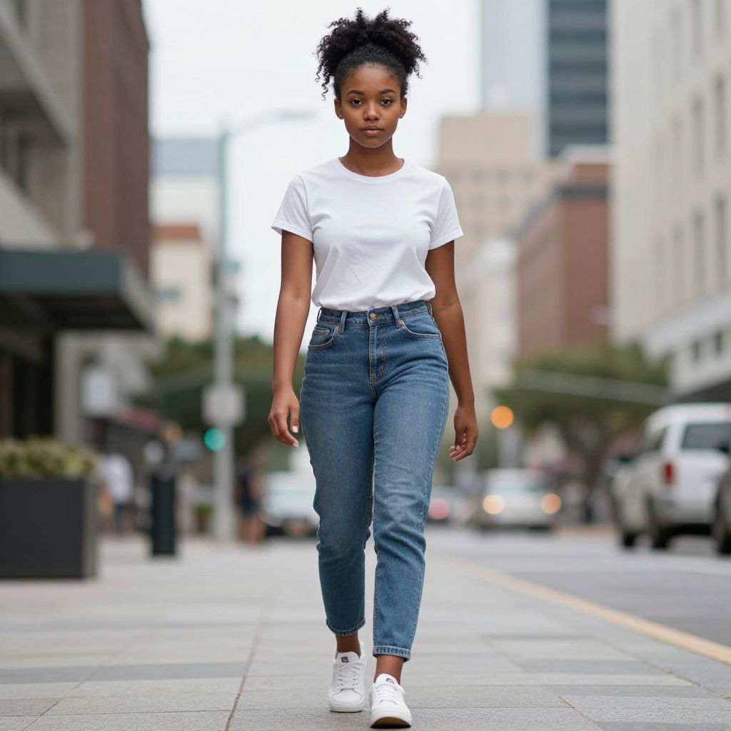 A young African American woman in her mid-twenties with a soft caramel complexion, deep brown eyes filled with quiet determination, stands confidently against an urban backdrop. Her dark curly hair is styled in a stylish yet casual updo that showcases the intricate details of her natural curls. She wears a simple white t-shirt paired with high-waisted jeans and trendy sneakers which complement her confident stride as she gazes directly into the camera, exuding pride and strength. The surrounding cityscape enhances the urban vibe of this portrait, highlighting the contrast between vibrant life and quiet determination in every step taken by this remarkable individual.