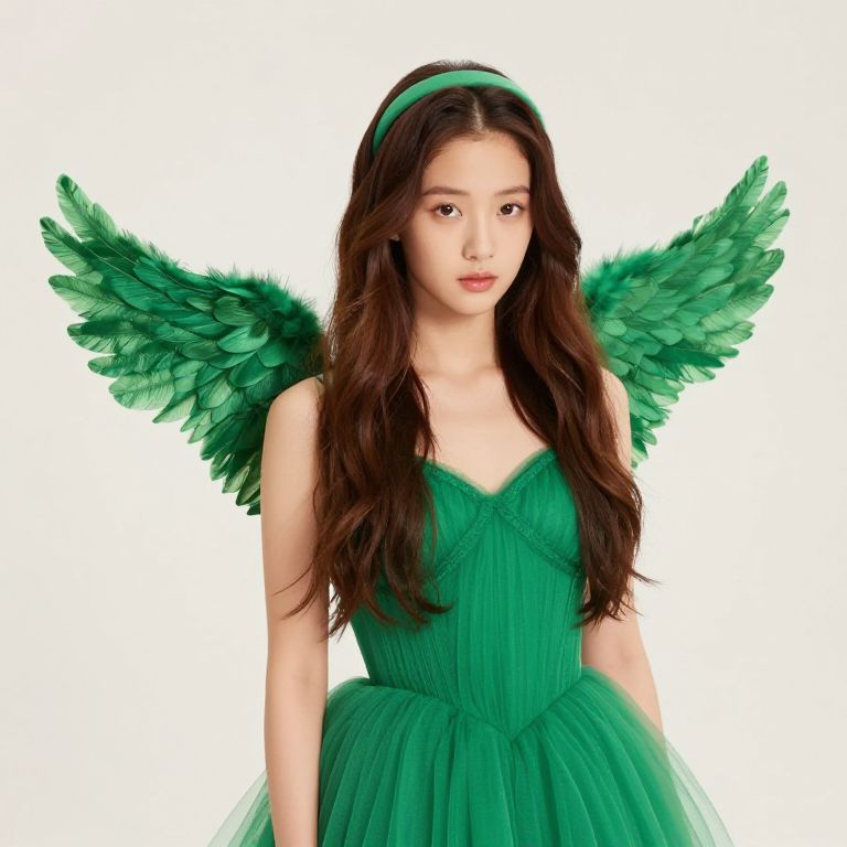 Female angel with long black hair and a crown on her head. She is wearing a green dress with wings and a necklace.