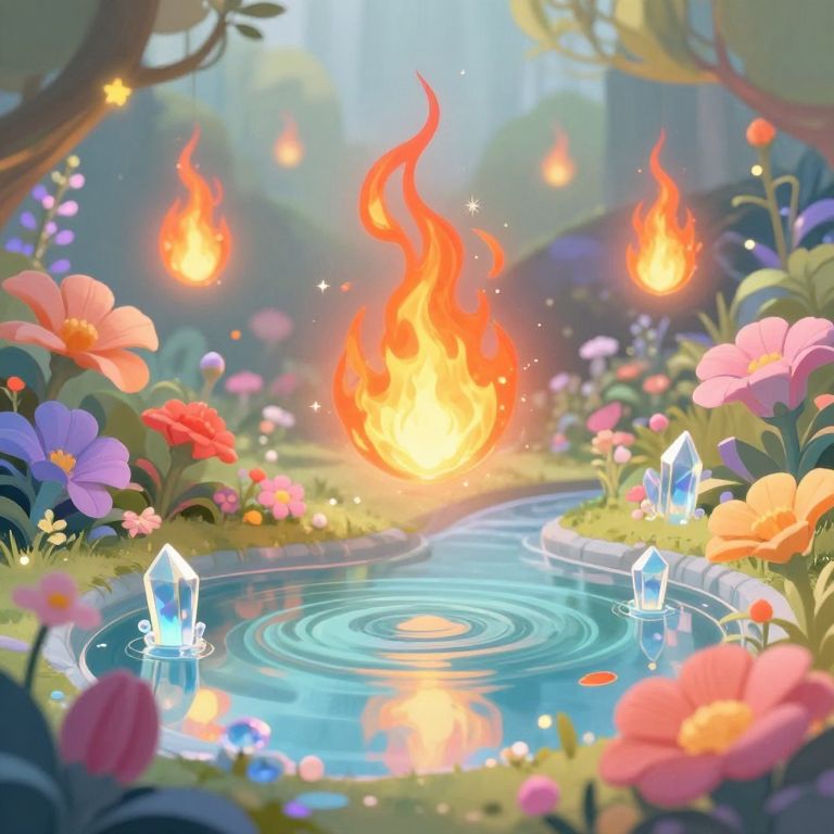 Feux in an enchanted garden, magical flames floating independently in the air above colorful exotic flowers and crystal-clear ponds, surreal and dreamy ambiance, soft lighting, digital illustration with pastel tones