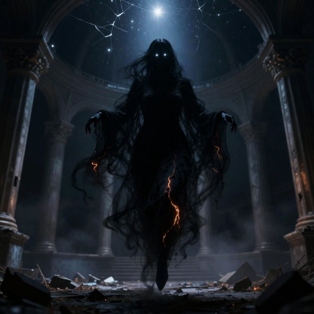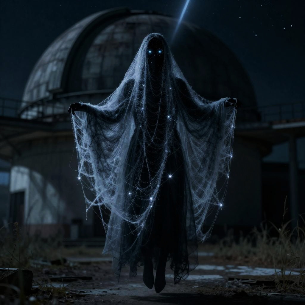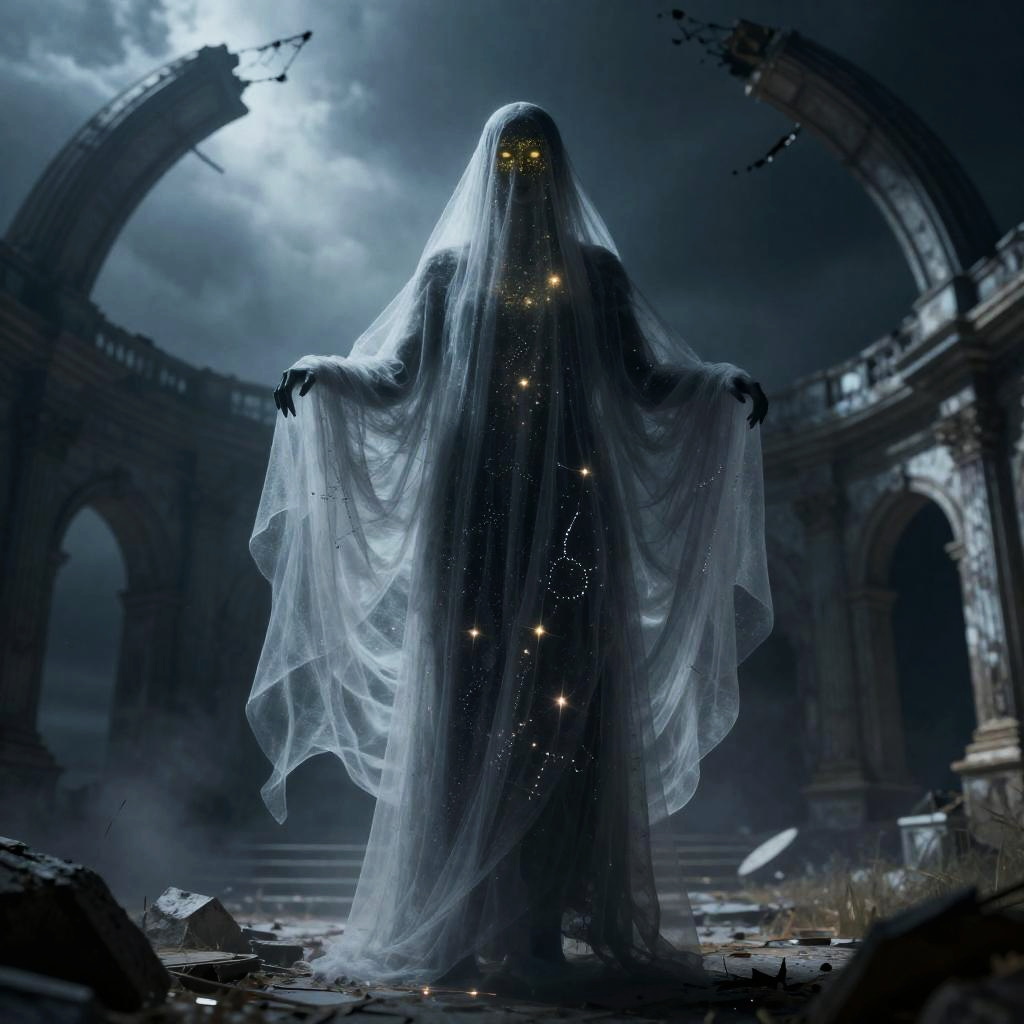 A ghostly wraith with void-black iridescent, studded with tiny stars eyes, its spectral form cloaked in cloak of drifting starlight and smoke, edges dissolving into constellations, floating ominously through a foggy forest.