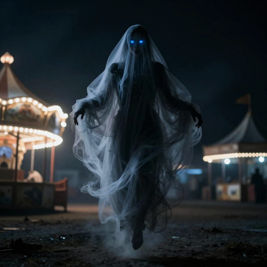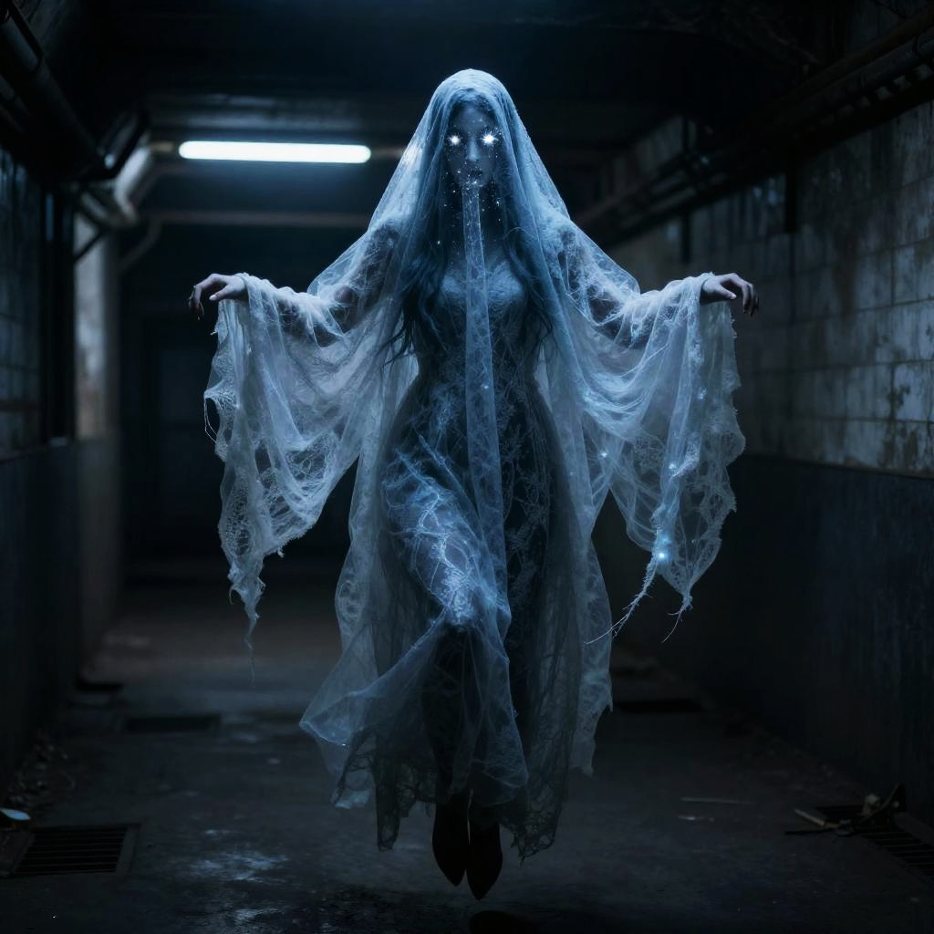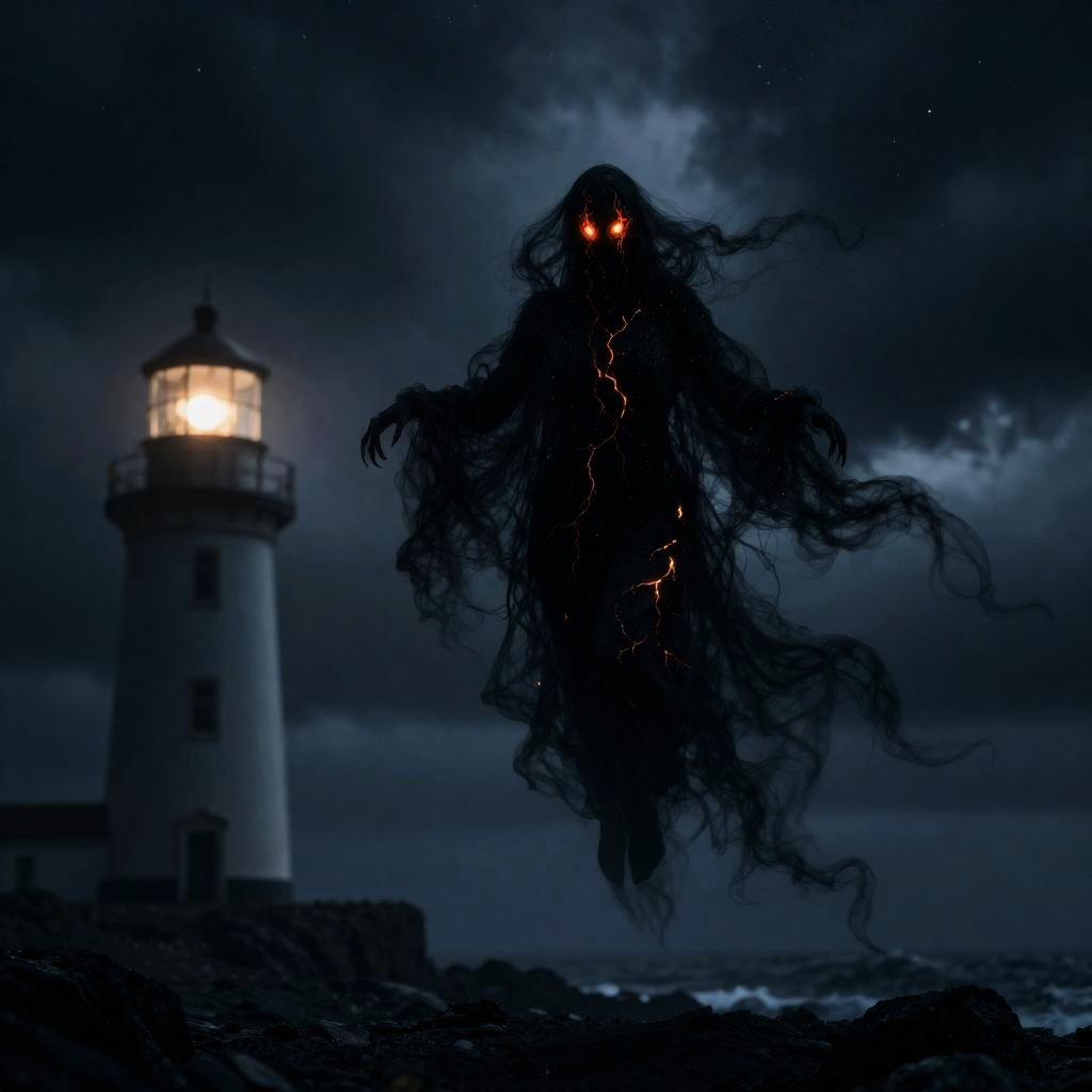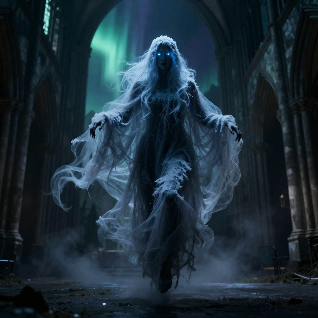 A ghostly wraith with void-black iridescent, studded with tiny stars eyes, its spectral form cloaked in cloak of drifting starlight and smoke, edges dissolving into constellations, floating ominously through a foggy forest.