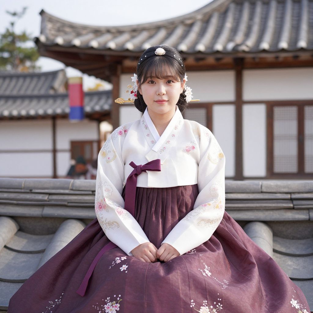 Photograph of a young East Asian woman in traditional Korean hanbok, white top with floral embroidery, maroon skirt, seated on stone steps,