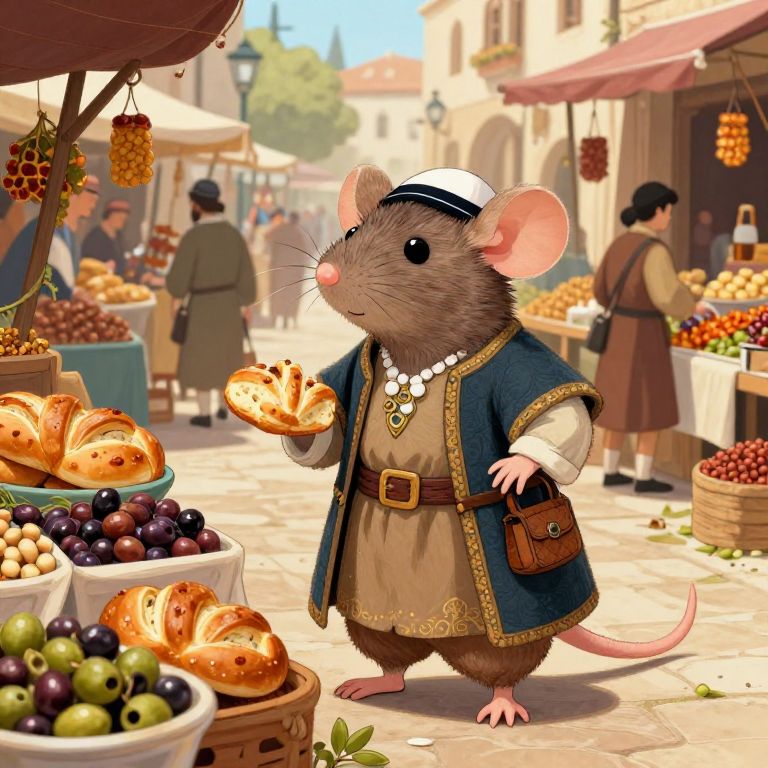 Jewish mouse in a bustling market scene, dressed in historical Jewish clothing with a yarmulke, surrounded by market stalls selling challah bread, olives, and spices, lively atmosphere with vibrant colors and detailed textures, a storybook illustration vibe.