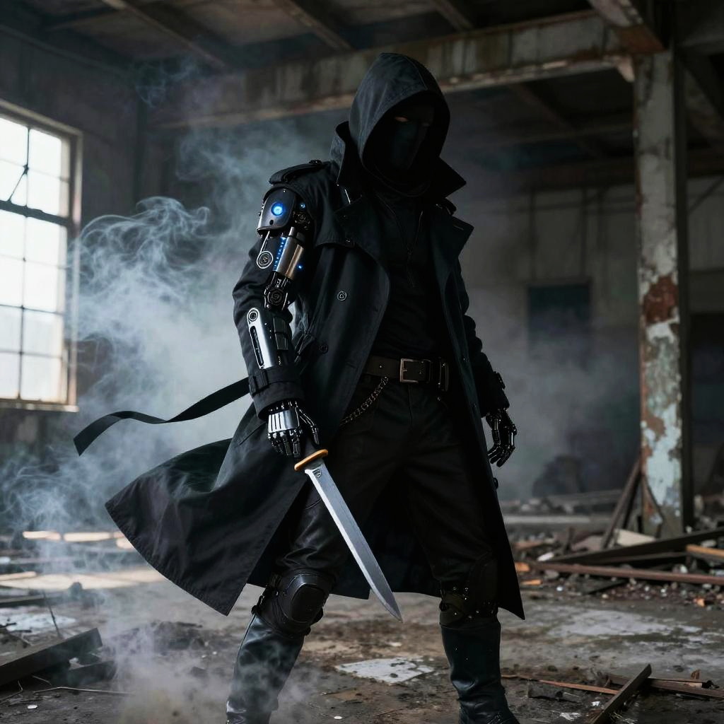 Assassian emerging from swirling smoke in an abandoned warehouse, dark trench coat flapping, futuristic cyberpunk aesthetics, glowing cybernetic implants, knife in hand, gritty urban decay, high contrast lighting, moody and intense atmosphere, highly detailed