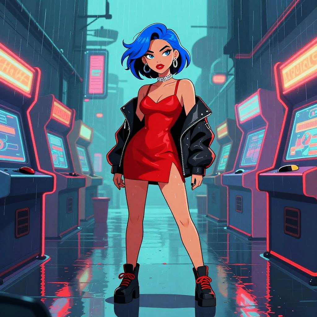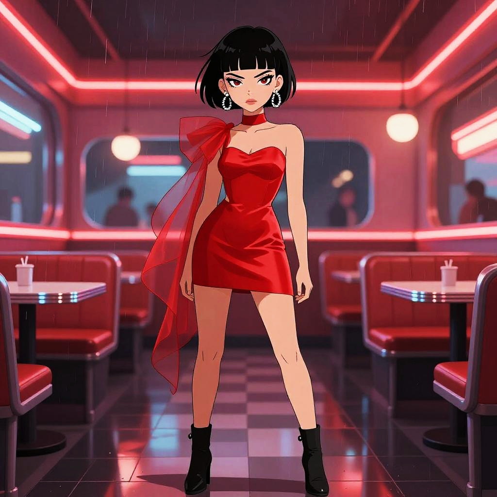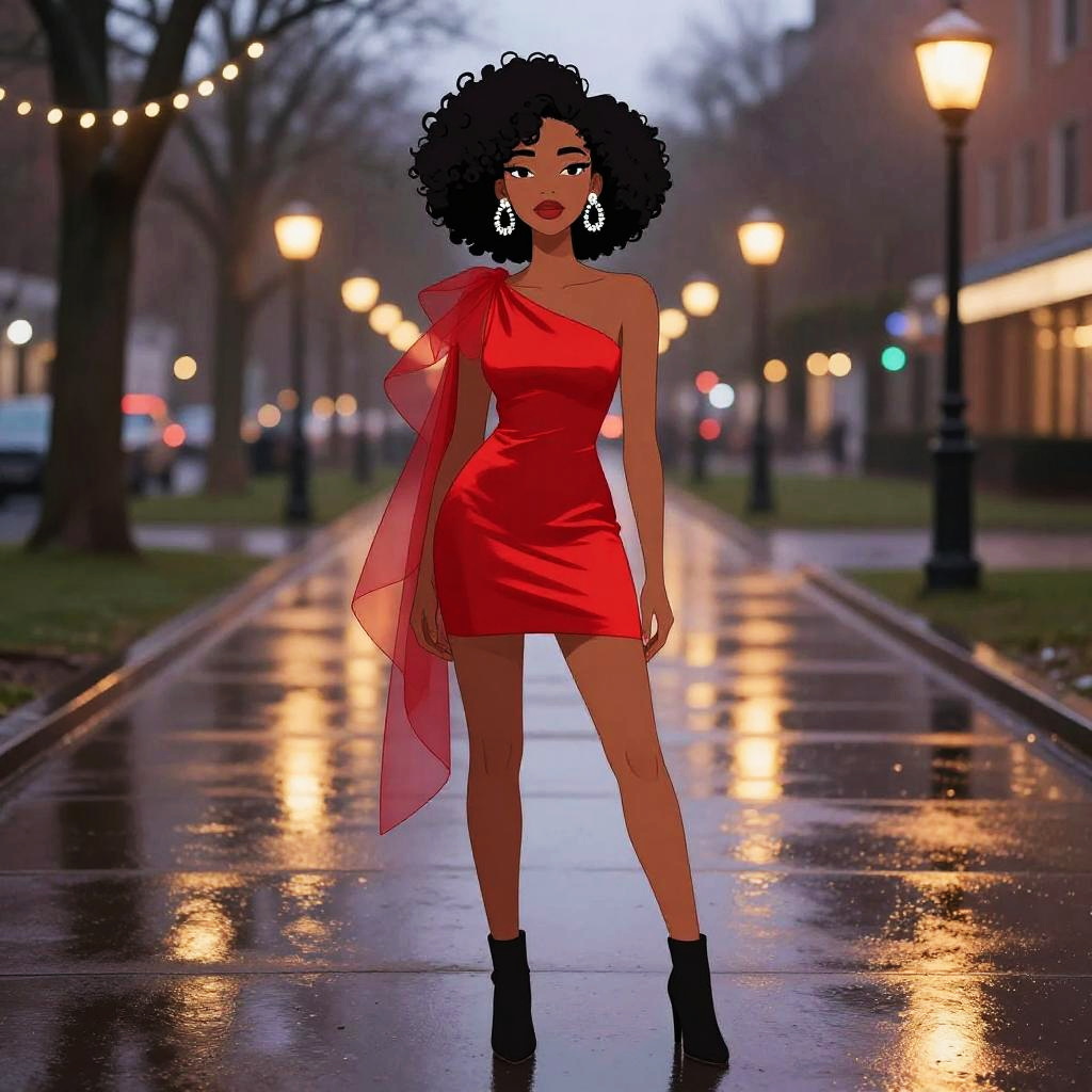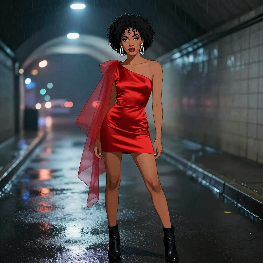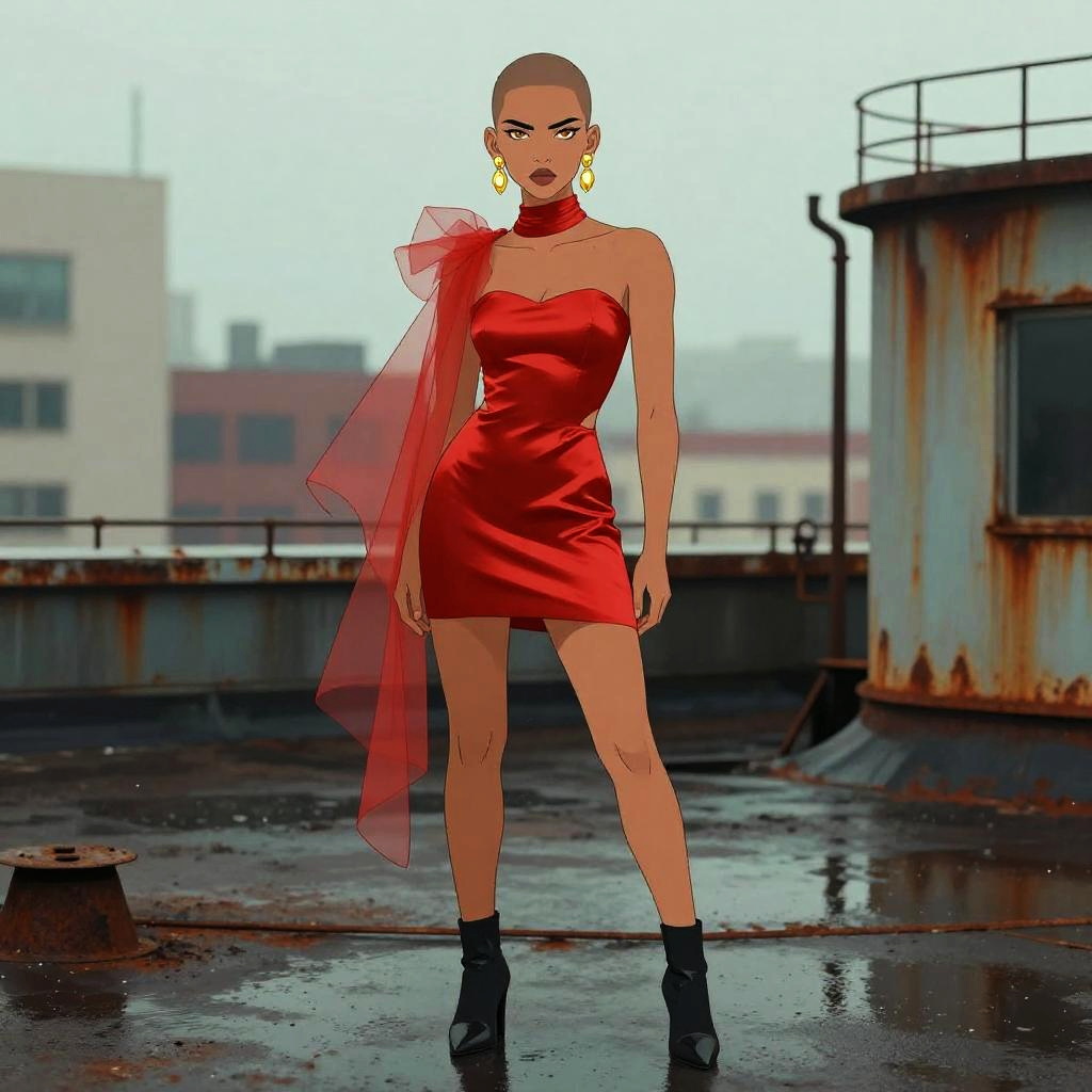 Industrial rooftop with rusted metal structures, athletic man with shaved head and piercing amber eyes. Bold red smooth satin bodycon mini dress with asymmetrical hem and cut-out sides; sheer organza scarf cascading down one shoulder; gleaming statement earrings; ankle boots; edgy vibe. contrasty warm orange light meeting cool teal shades, rain-slick reflections, cinematic haze, urban fashion editorial energy, full-body stance, crisp detail, tactile fabrics, color-driven composition, rebellious yet refined mood. --sref 1467