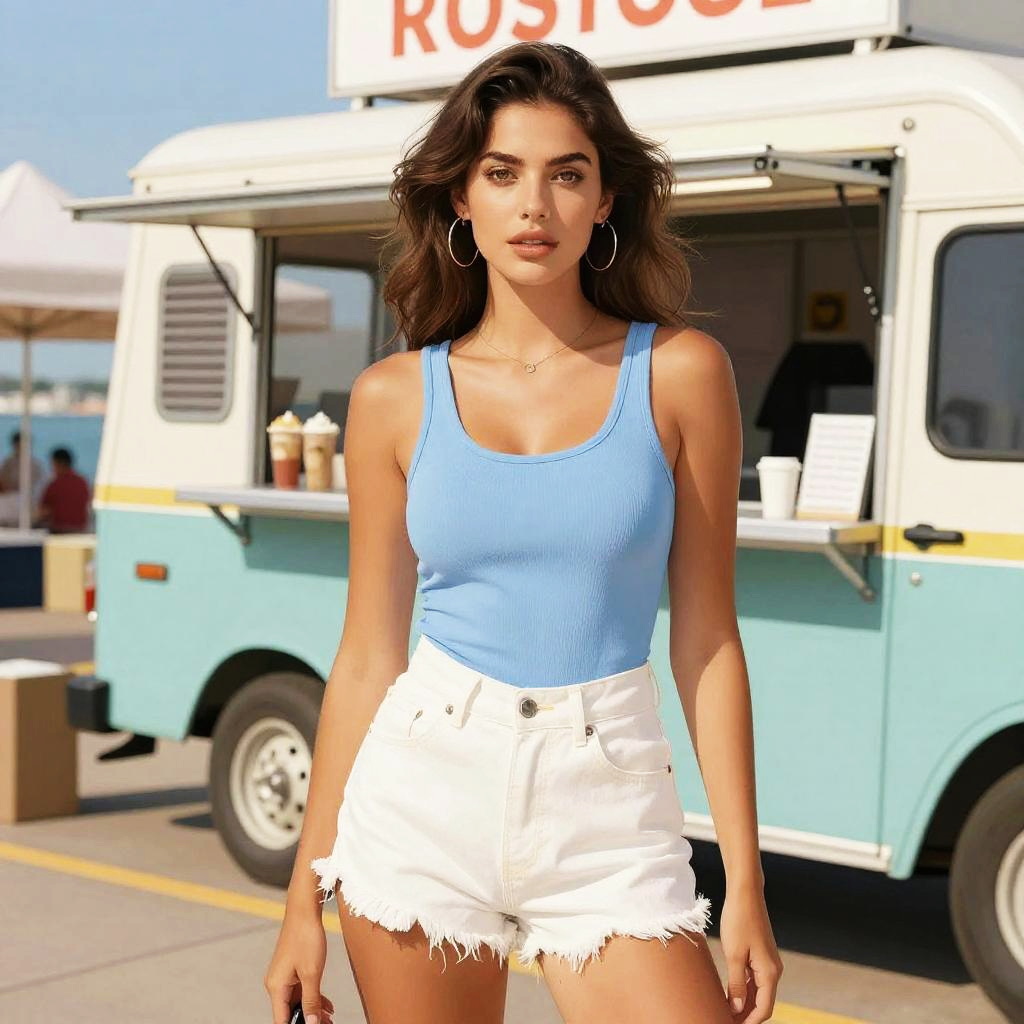A hourglass woman in a casual chic style, wearing a charcoal gray V-neck T-shirt and white denim shorts, layered necklaces, and a bracelet, stands at a vibrant 1970s neighborhood block party, surrounded by colorful decorations and lively festivities. Sexy. Pretty face and beutiful eyes