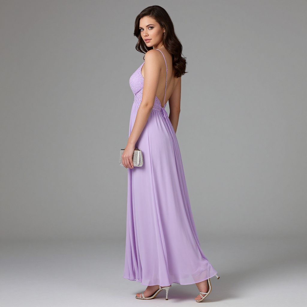 "Backless chiffon dress, flowing silhouette, soft lavender chiffon, delicate lace trim, adjustable spaghetti straps, paired with strappy silver heels, minimalistic silver jewelry, elegant clutch bag, light makeup, soft waves hairstyle.. Sexy. Pretty face and beаutiful eyes. Big breasts."