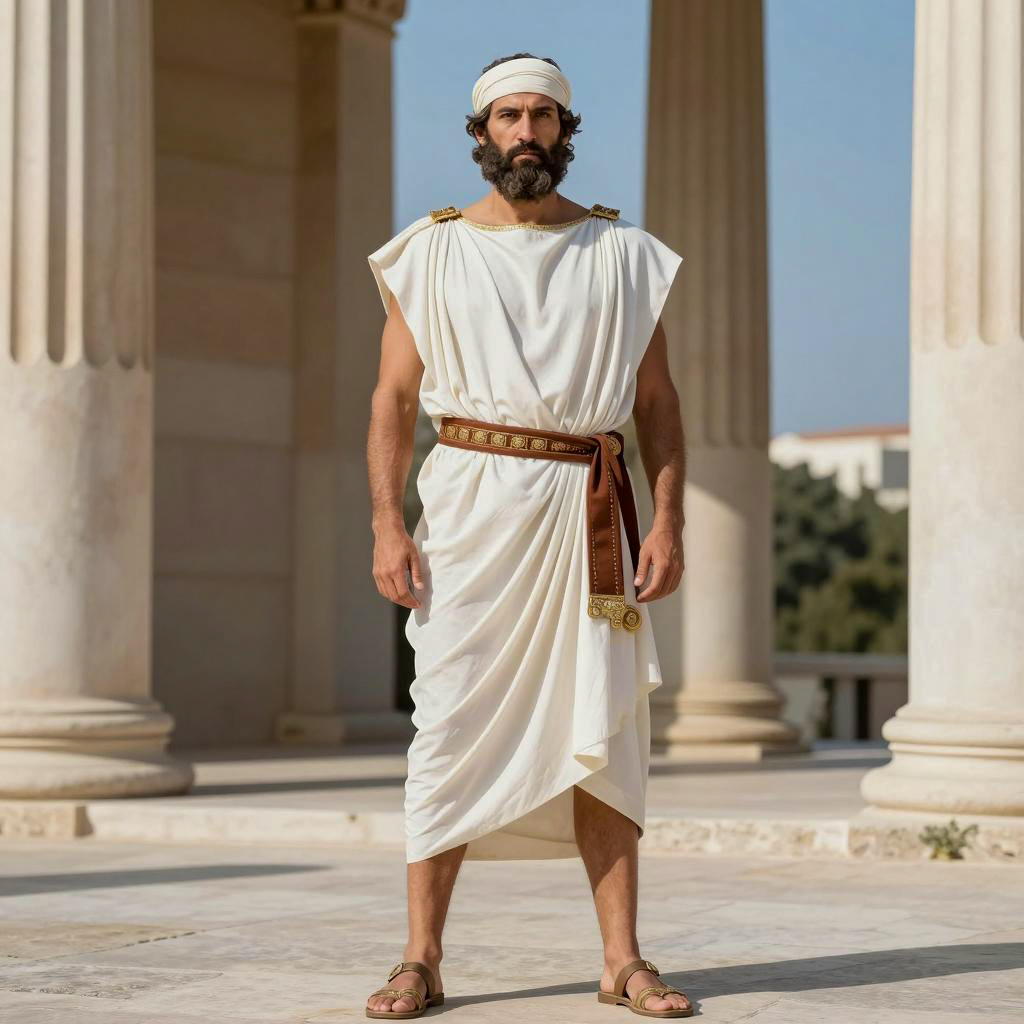 Greek toga costume man, photograph of a middle-aged man, standing, ancient Greek style, white toga, brown belt, white head wrap, bearded, muscular, barefoot, sandals, stone column background, daylight, outdoor setting, serious expression, classical, historical, Mediterranean, clear sky, realistic, full body shot