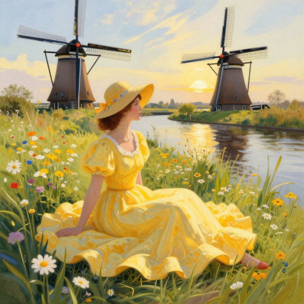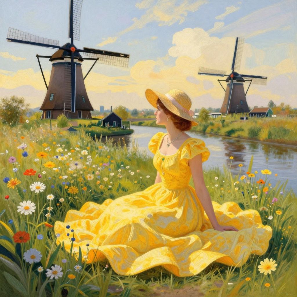 A vibrant digital illustration inspired by Willem Haenraets' impressionist style, featuring a woman in a flowing yellow dress and sunhat sitting amidst wildflowers, with Dutch windmills and a serene canal in the background, capturing the essence of a golden-hour scene in Holland.