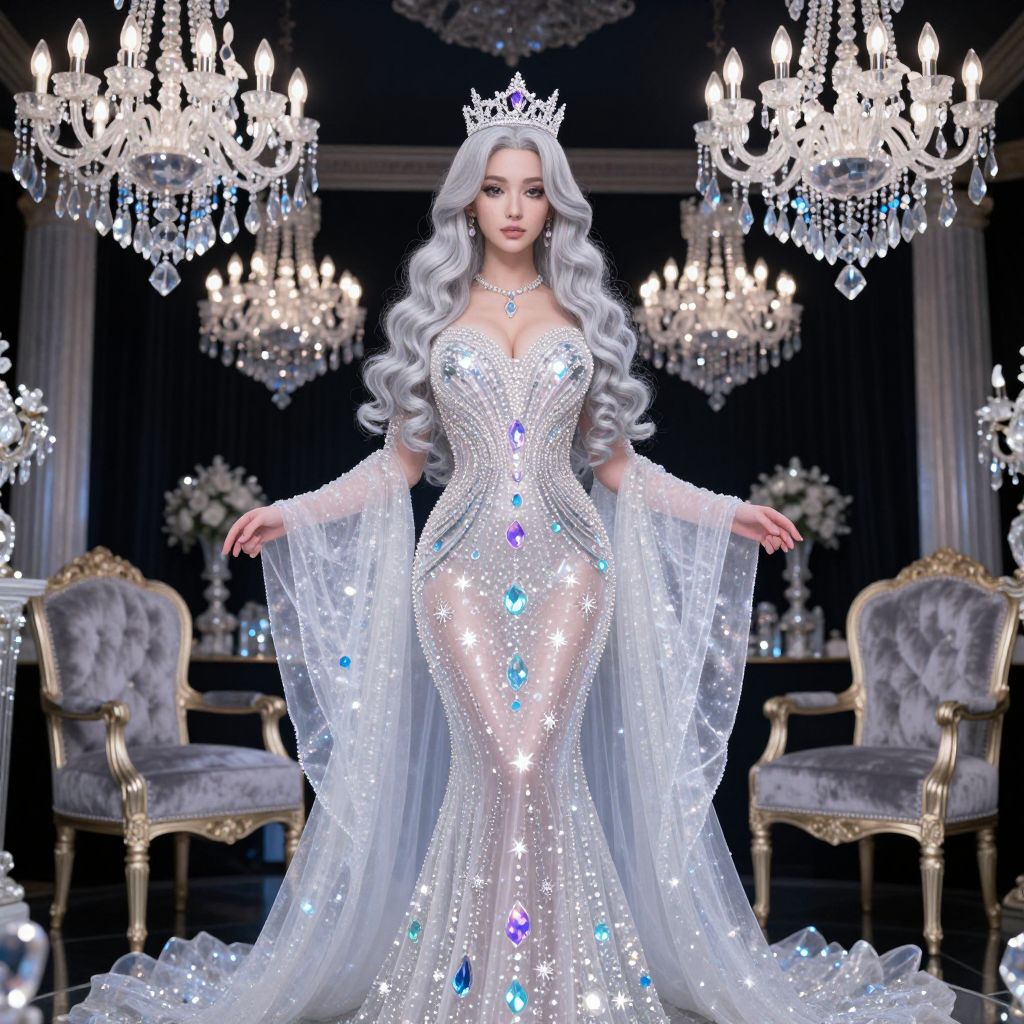 A grand luxury setting of a crystal queen at a high-society gala, the woman has long, wavy silver hair and a serene, elegant face, dressed in a flowing gown that pulses with embedded gemstones that shimmer like living stars, surrounded by opulent velvet chairs and chandeliers made of clear quartz and colored topaz. The woman has big tits and cute face
