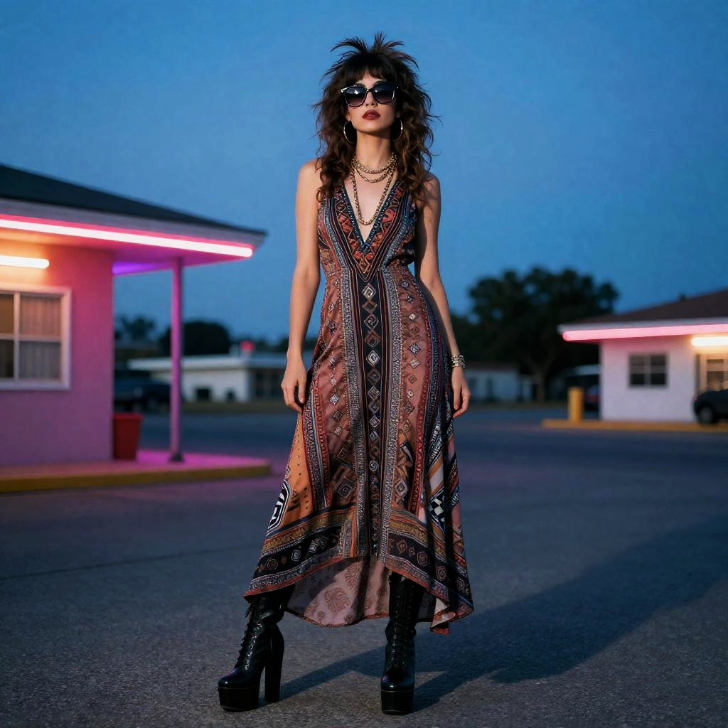 70s outfits: nostalgic lounge singer with a silk headscarf, smoky eyeliner, and a vintage microphone dressed in a flowy maxi dress with psychedelic prints, accessorized with oversized sunglasses and layered necklaces, posing in a dimly lit speakeasy.