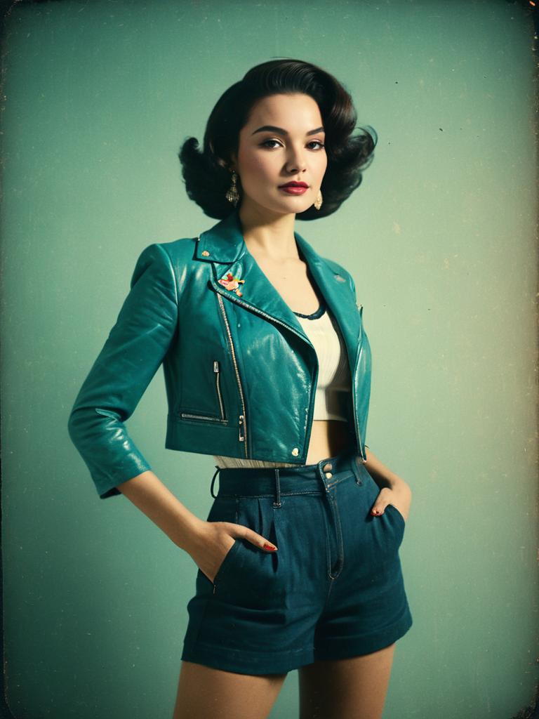 Woman, casual edgy, black leather biker jacket with lapel collar and multiple zipper details, adorned with small colorful patches, white crew neck t-shirt underneath, high-waisted black shorts, minimalist style, bare legs, light background with no distinctive features. --sref 1387