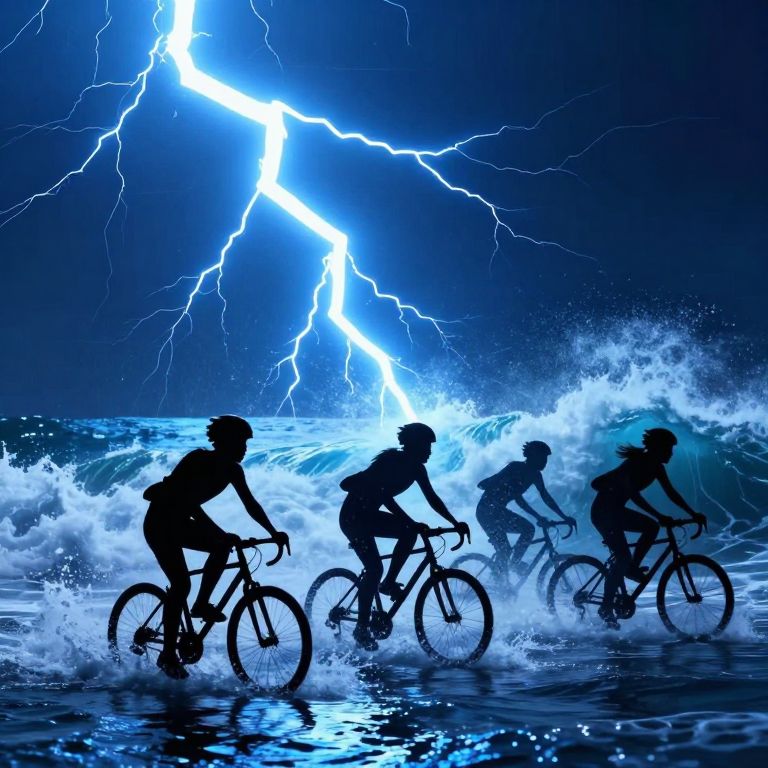 Silhouetted cyclists racing through ocean waves under a vivid blue lightning bolt in a dramatic, electrifying nighttime scene. Digital illustration.