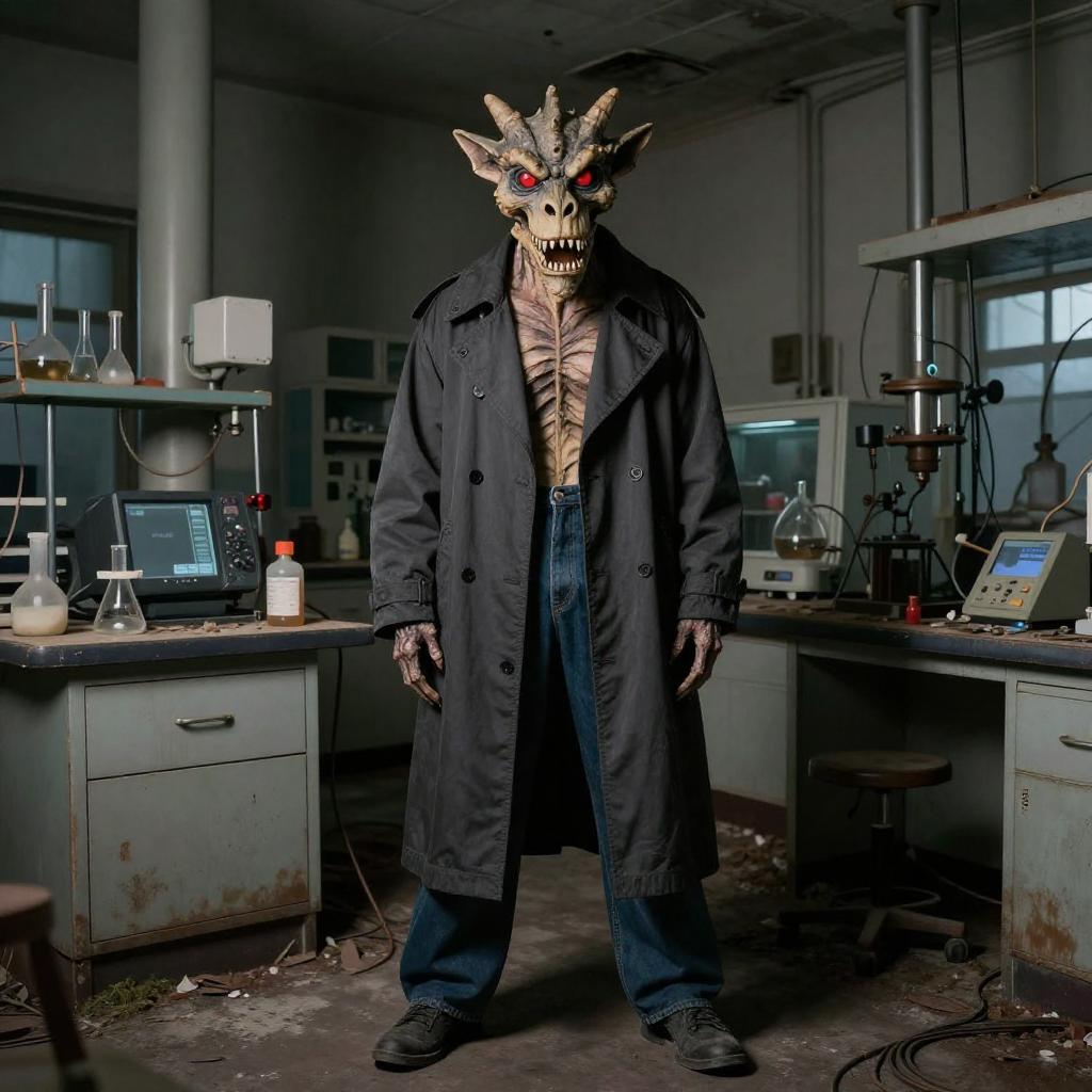 Realistic photo.Retro Trends A Balenciaga fashion photoshoot modeled by famous monsters. Gargoyle as the model, shot by Annie Leibovitz. The shoot takes place in an abandoned laboratory. The atmosphere is eerie and creepy, with a sense of otherworldliness. The style is fine art photography, shot with a Nikon D6. realistic photo