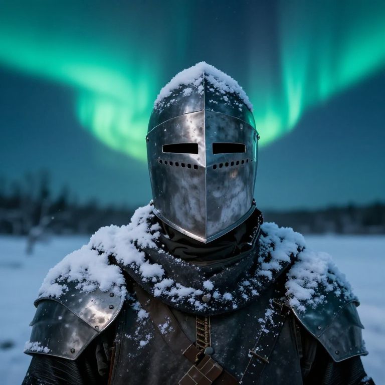Photograph of a snow-covered armored knight with a reflective helmet, standing in a snowy landscape under vibrant green aurora borealis.