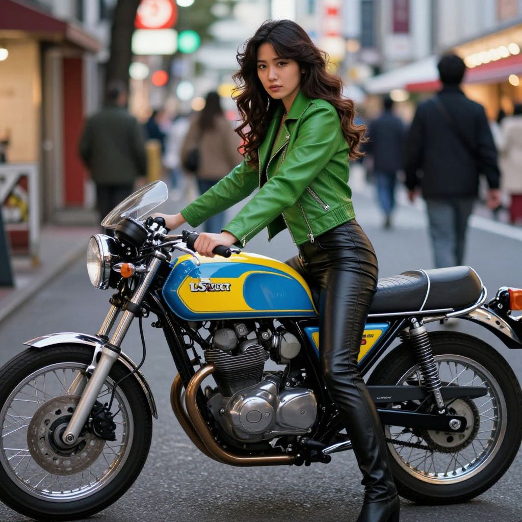 In the heart of Tokyo's bustling streets, a striking 25-year-old Japanese woman with long, wavy hair stands confidently in front of a classic cafe racer motorcycle. Her outfit, a stylish combination of a green leather jacket and black leather pants, exudes a sense of edgy sophistication. The motorcycle, with its polished chrome and vibrant blue and yellow accents, is a testament to the timeless appeal of vintage motorbikes. The woman's gaze is directed towards the camera, her expression both alluring and enigmatic. The background, a blend of vibrant colors and indistinct figures, adds depth to the scene, creating a dynamic interplay of light and shadow. The overall composition, with its dramatic lighting and realistic details, captures the essence of 1970s America, evoking a sense of nostalgia and a touch of the 1980s. The image is a beautiful blend of color, texture, and form, with the woman and her motorcycle as the central focus, surrounded by the vibrant energy of the city.