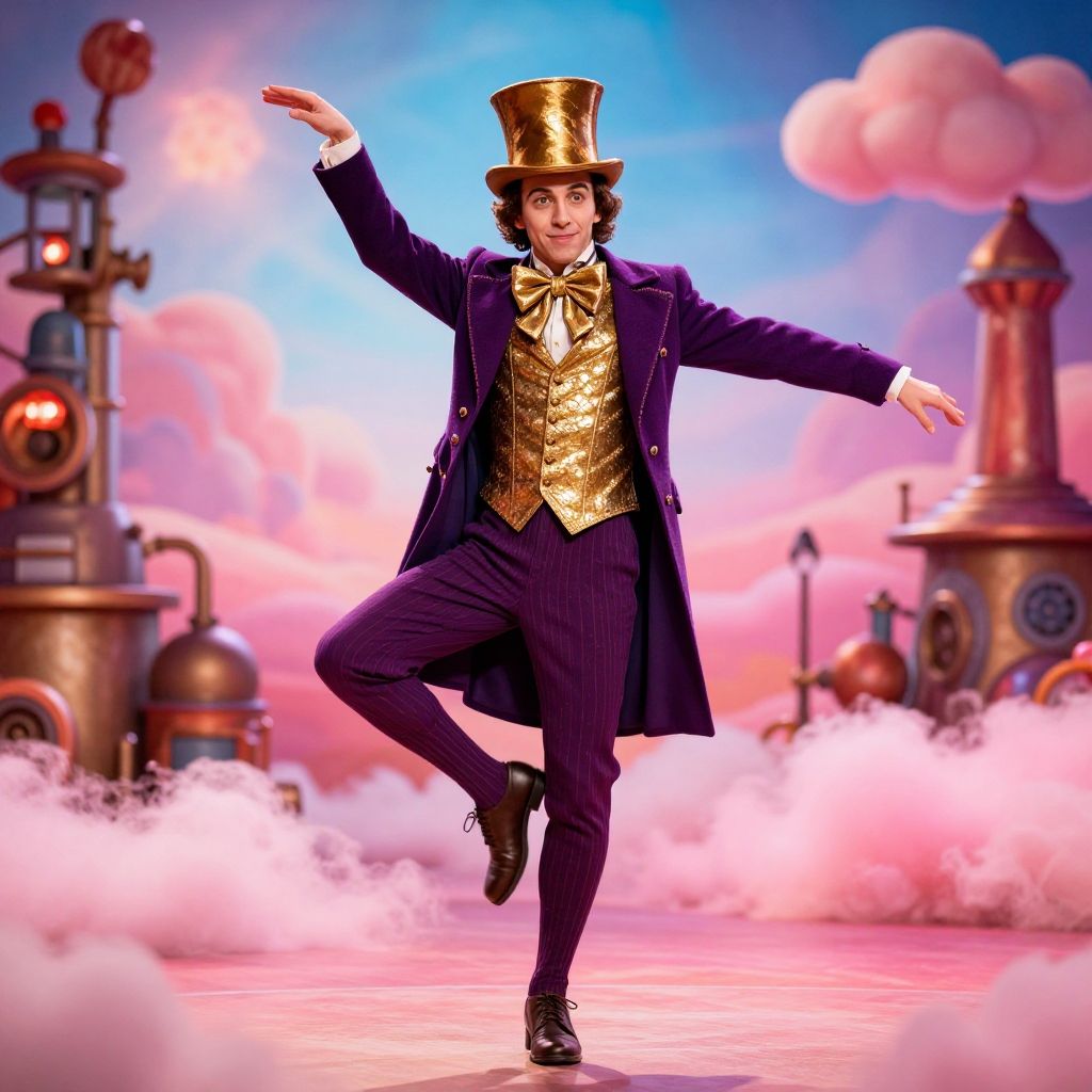 Willy Wonka dance costume, stylized theatrical outfit with fitted purple frock coat, gold embellishments, large bow tie, and distinctive top hat, poised in mid-dance against a surreal backdrop of candy clouds and surreal factory machinery, dynamic lighting