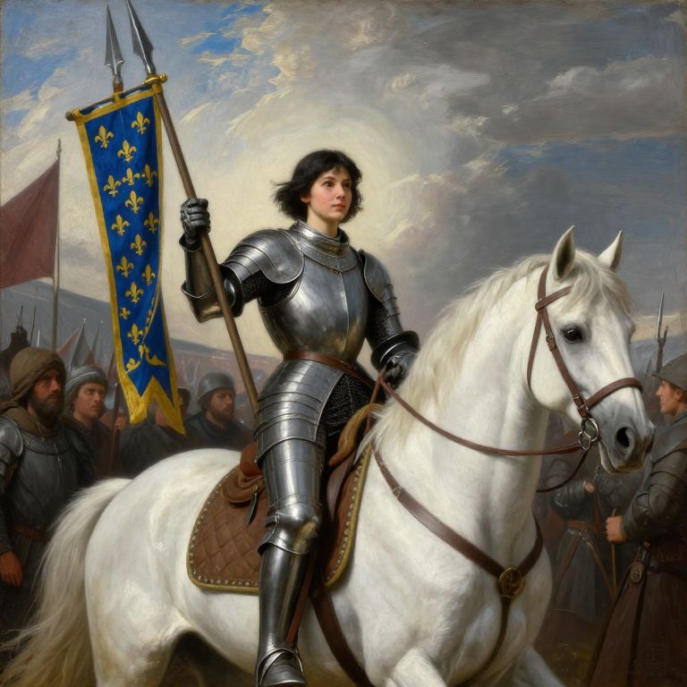 Painting of a medieval woman in silver armor, holding a flag with fleurs-de-lis, riding a white horse, surrounded by soldiers.