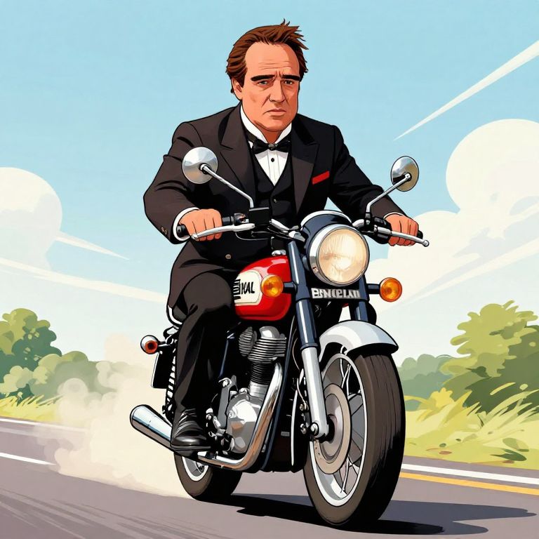 Michael Corleone cartoon illustration Royal Enfield Classic 300 motorcycle, riding towards the camera, low angle shot,
