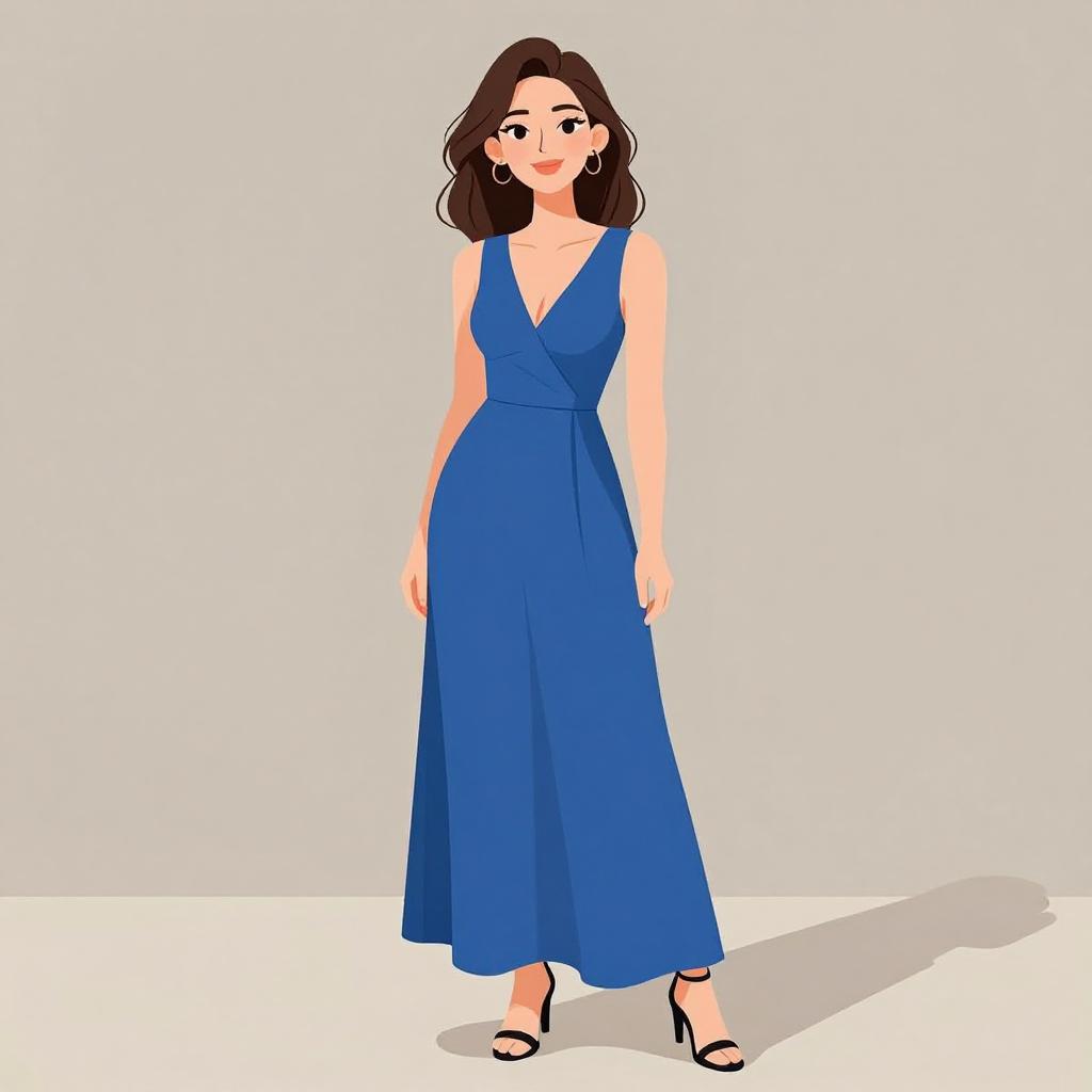 A digital illustration of a young woman with light skin and shoulder-length brown hair. She wears a sleeveless, deep blue, V-neck maxi dress that cinches at the waist and flows to her ankles. She has black, open-toe high heels and small hoop earrings. Her expression is neutral, and she stands against a plain, white background with a soft shadow on the ground beneath her. The style is simple and flat, with minimal shading and clean lines, emphasizing her elegant attire and poised stance.