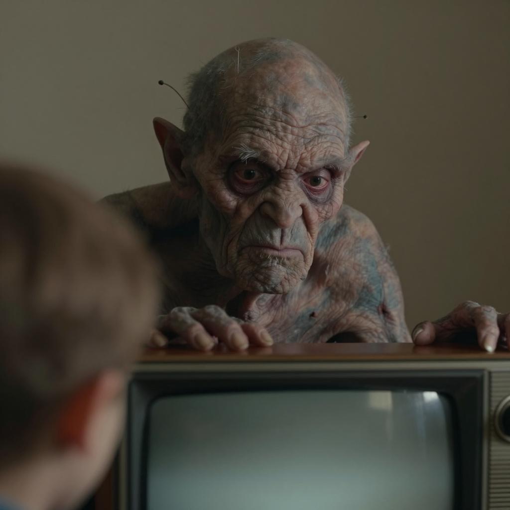 Old, wrinkled, bald monster with grayish-blue skin and small antennae on its head looks intently into a vintage television screen. The monster's face is heavily ured with deep wrinkles and scars. A blurred, light brown-haired figure is partially visible in the foreground. The background is a plain brown wall. The television has a dark screen.