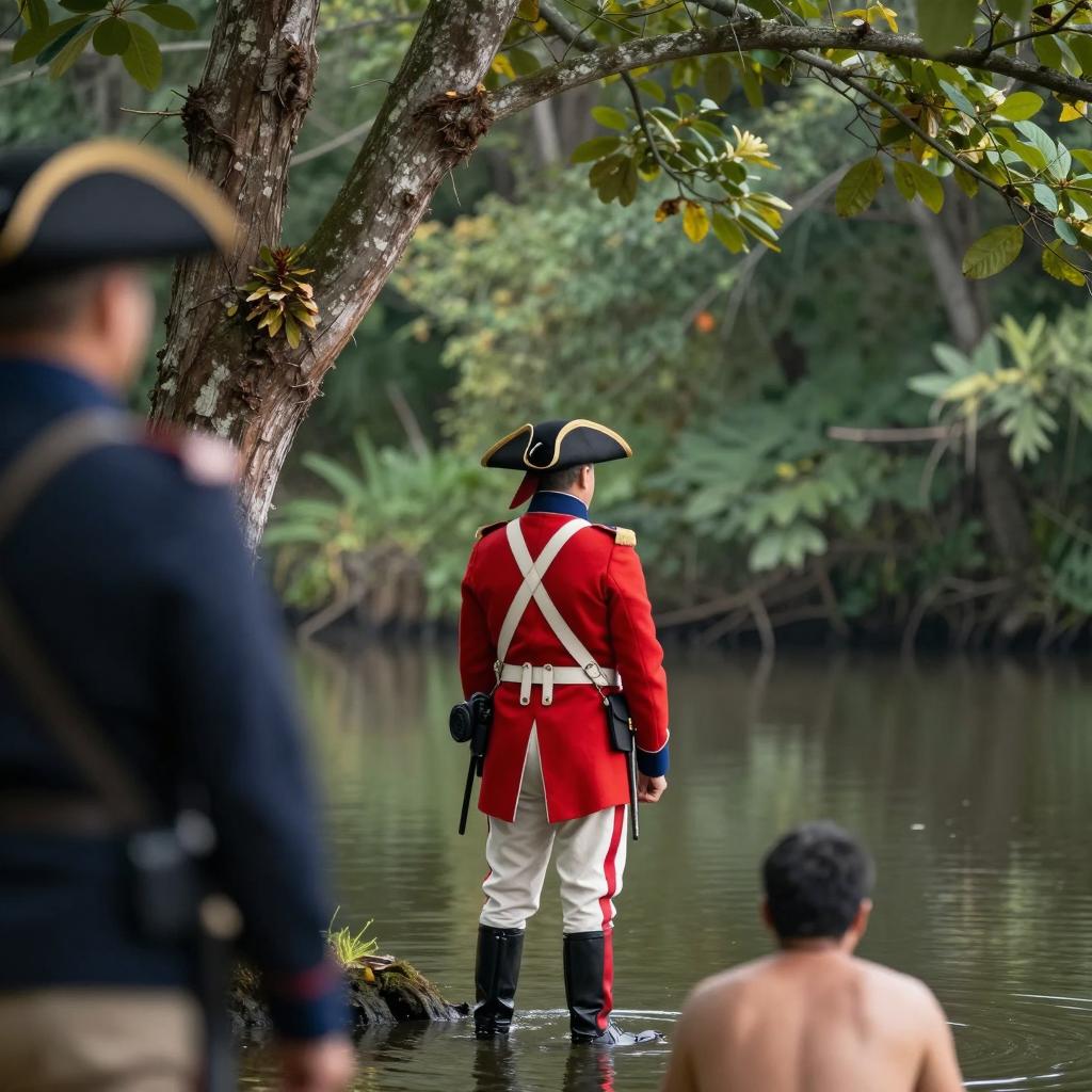 A forest scene. Soldier in red coat with white waistcoat and tricorn hat stands under large tree, back to camera. Soldier has white crossbelt and black backpack. Two people in water, partially submerged, in foreground. Green, leafy trees and calm water in background. Partially obscured person on left. Soldier's back to viewer, faces water.