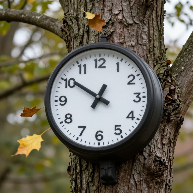 Photograph of a black, round wall clock with white face and black numbers, mounted on a textured tree trunk, surrounded by autumn leaves.
