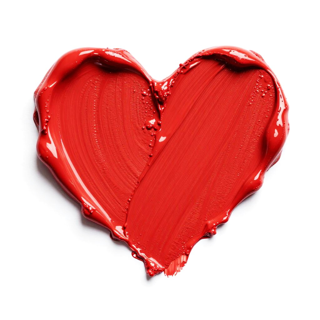 This is a close-up photo of a vibrant red heart shape made from thick, textured paint. The heart has rough, brushstroke edges and a glossy finish, giving it a slightly three-dimensional look. The background is completely white, making the red heart stand out prominently. The paint's texture adds depth and a handmade feel to the image.
